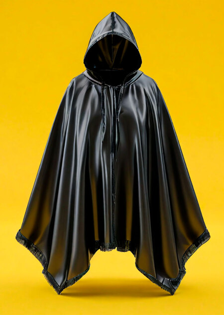 ПРОМТЫ 1. black glossy poncho raincoat with hood. 3d render, on a yellow background, balenciaga style 2. a yellow machine without any markings with items of clothing sealed in transparent bags, the machine is located in subway 3. models walk along the subway in black wet glossy ponchos with hoods, faces not visible, balenciaga type 4. a huge illuminated black glossy wet raincoat poncho illuminated with yellow light hanging on a hook in a big dark city. balenciaga type performance