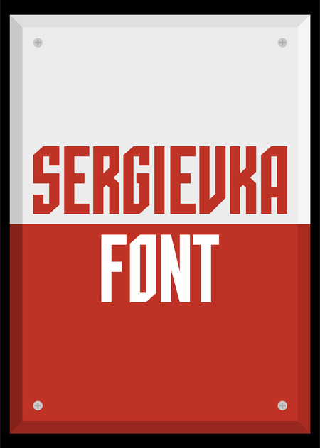 SERGIEVKA — шрифт, вдохновленный творчеством советских коммунальщиков и русской деревней. Прототипом послужила надпись на старой служебной табличке, найденной мной прошлым летом в деревне Сергиевка, где живет моя бабушка. Шрифт геометричен, состоит из прописных, не имеет выносных элементов и свисаний, однако, несмотря на современность форм, некоторые элементы шрифта отсылают к историческому письму.