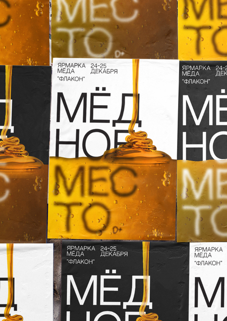 Мёд обладает особой вязкой и упругой текстурой, а также ярким узнаваемым цветом. Совокупность данных особенностей и легла в основу айдентики ярмарки мёда.