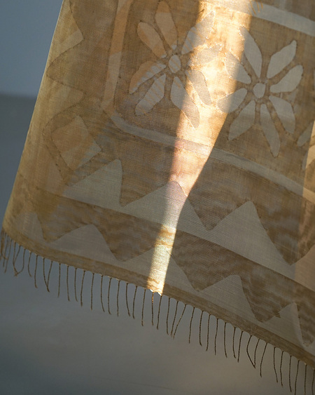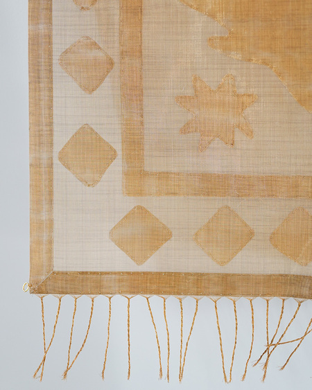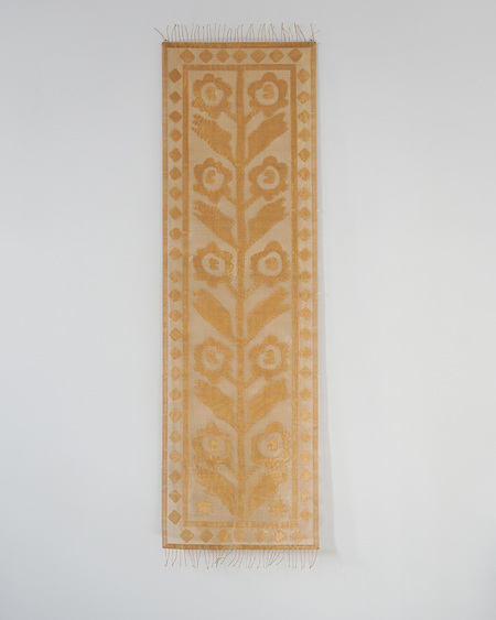 In her work, Anna Chervonna rethinks cultural heritage through household items. The collection uses five characteristic ornaments of the old (early) period of Krestinsky carpets: «Tray», «Chop», «Birch», «Thought», «Flower pattern» (geometric and floral geometric ornaments). «A carpet on the wall was an ordinary attribute in the house for many residents of Russia. For me, it is a kind of lost code that unspoken thread unites people. In my artistic practice, I look for objects that are familiar to many and recreate them from brass mesh. The material is transparent, this is how I emphasize the unreality of objects of the past, — says the author. At the stage of collecting materials, I was most „drawn“ to the Krestinsky carpets — without ideal symmetry and honed hypnotic selection of elements. All the carpets from the „Krestiki“ collection are made according to original samples, photos of which were provided by the Omsk Region State Center of Science and Technology. It was important for me to preserve the „live“ pattern of the original carpets as much as possible in order to create a „print“ of memory from brass mesh.»