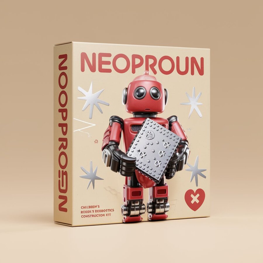 create a packaging of a children’s robotics construction kit. in beige, red and silver colours, with the name ‘NEOPROUN’