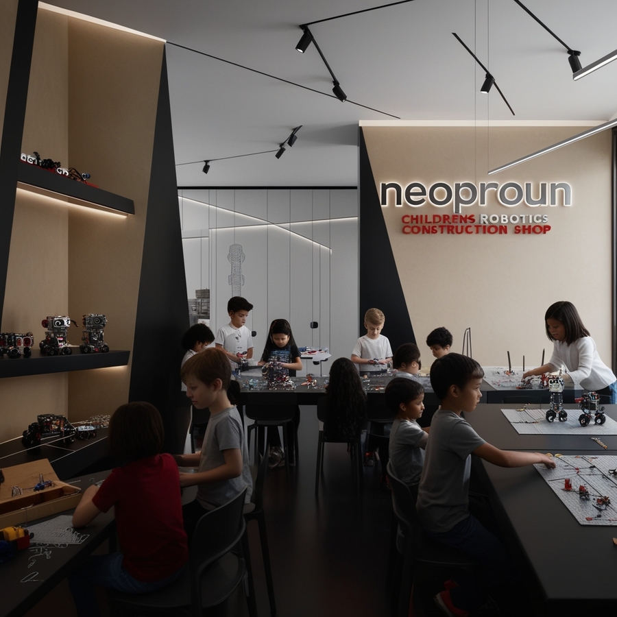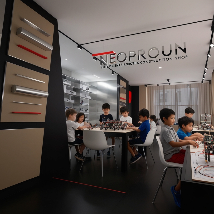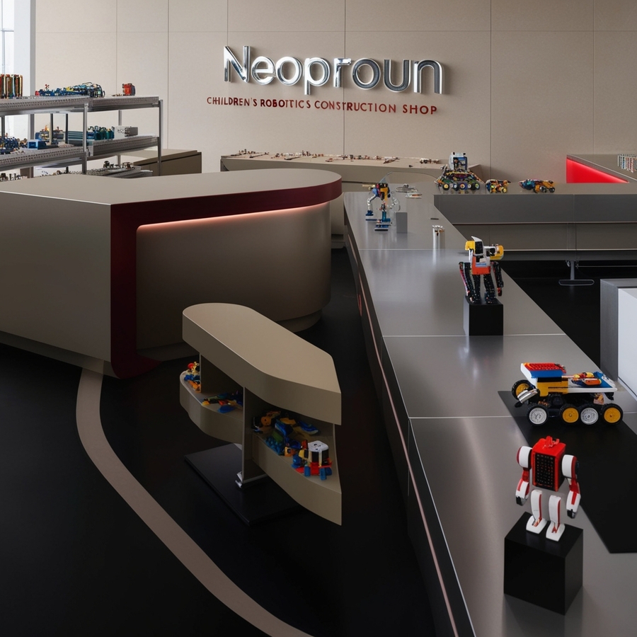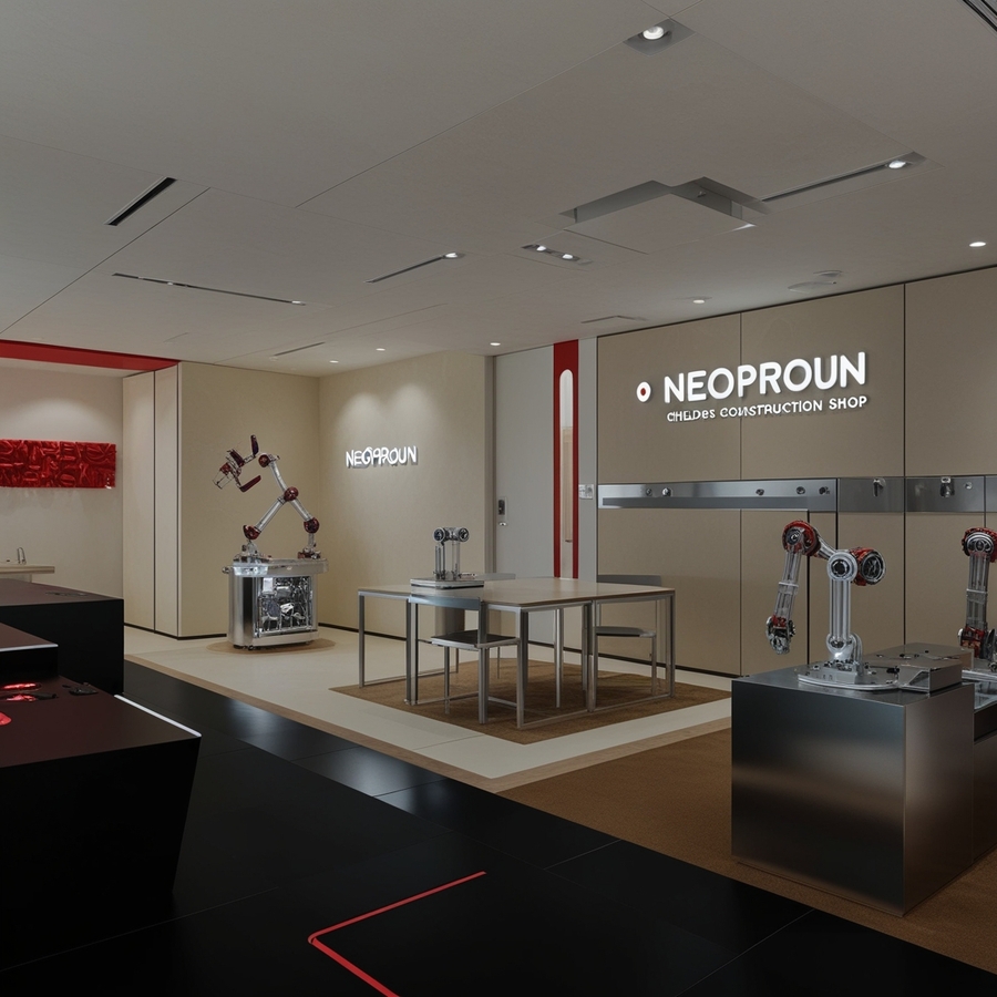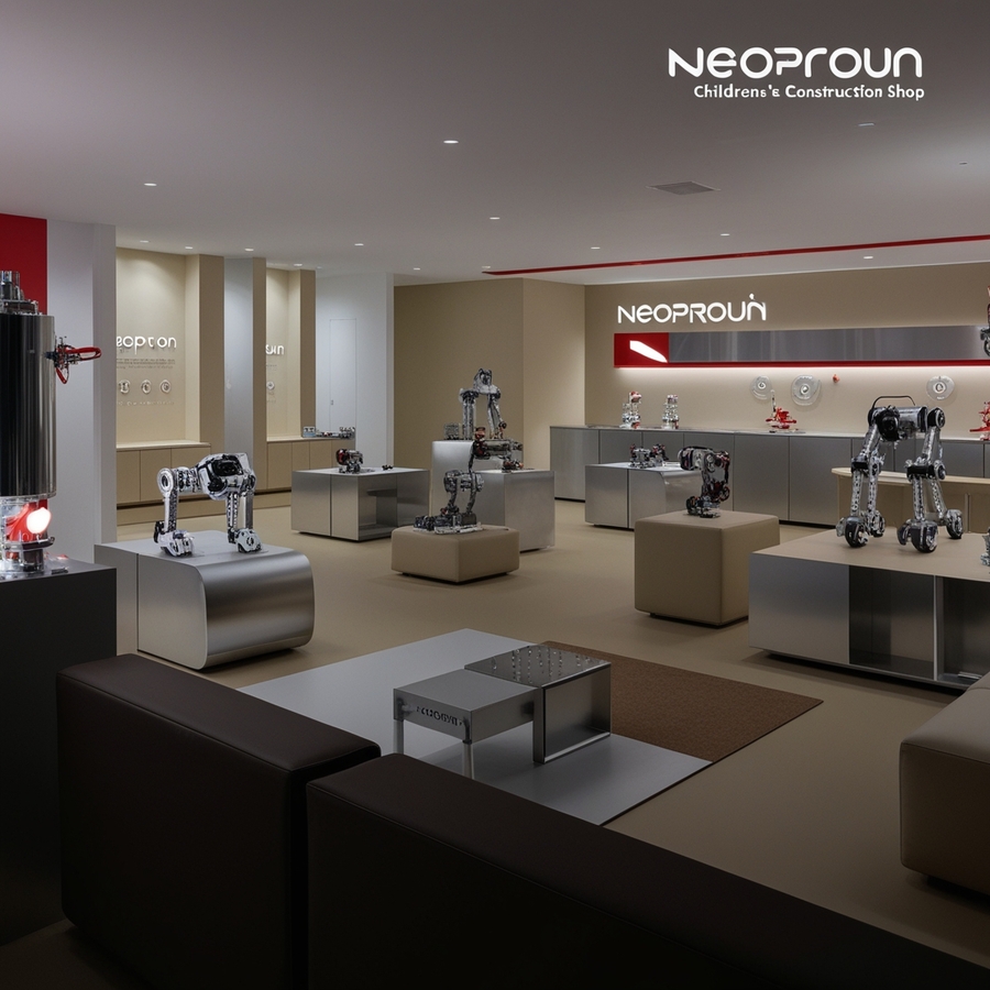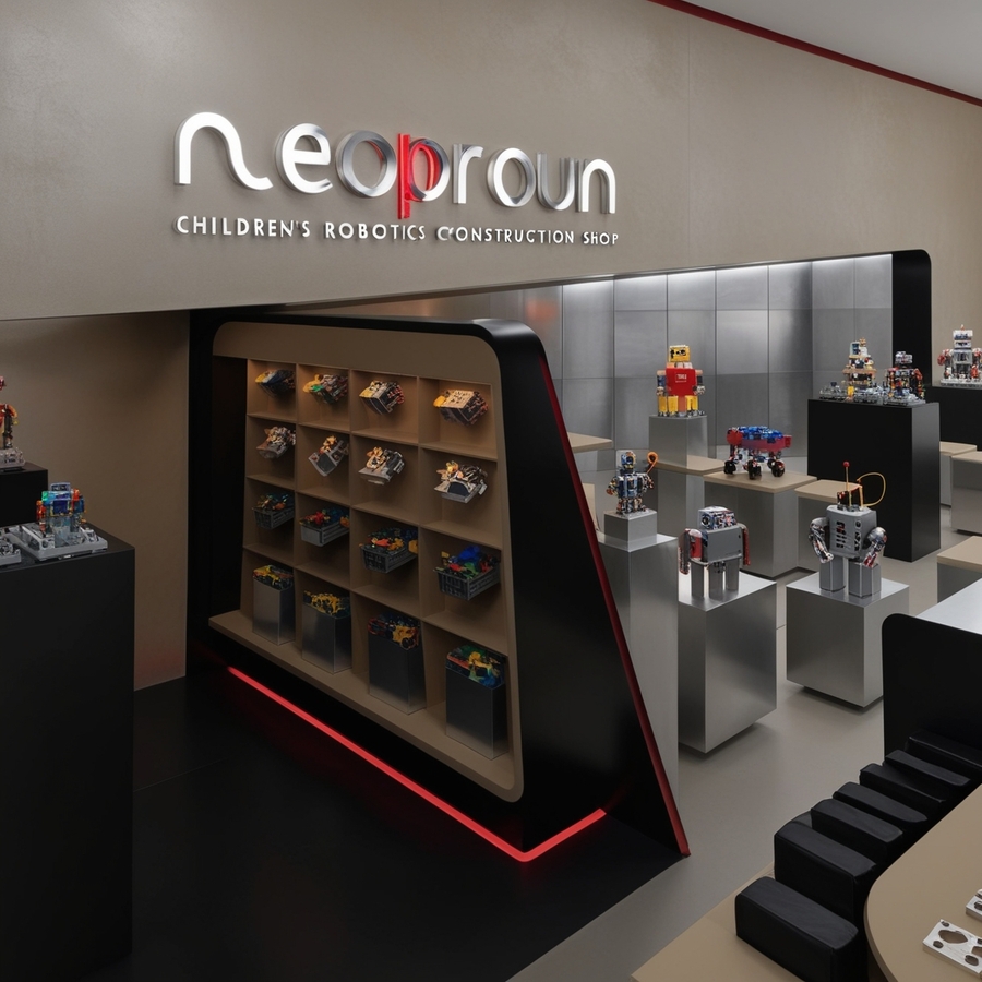 Create a modern interior for a children’s constructor shop for robotics, use beige, silver and red colours, name ‘’NEOPROUN‘’, minimalism