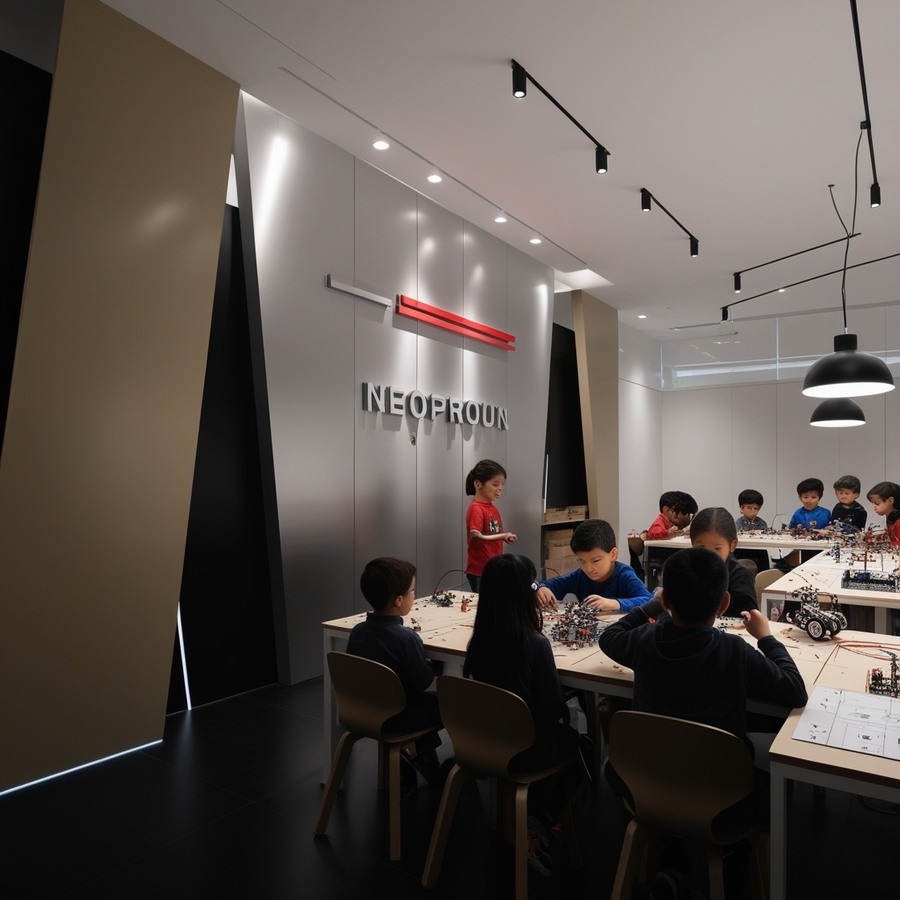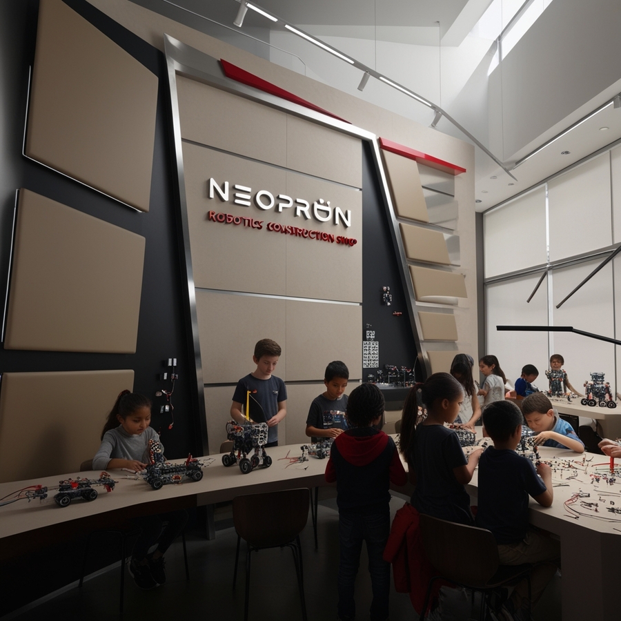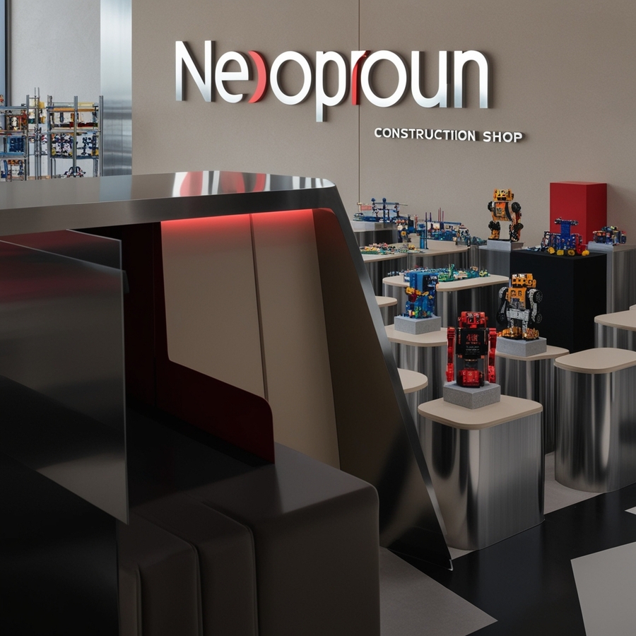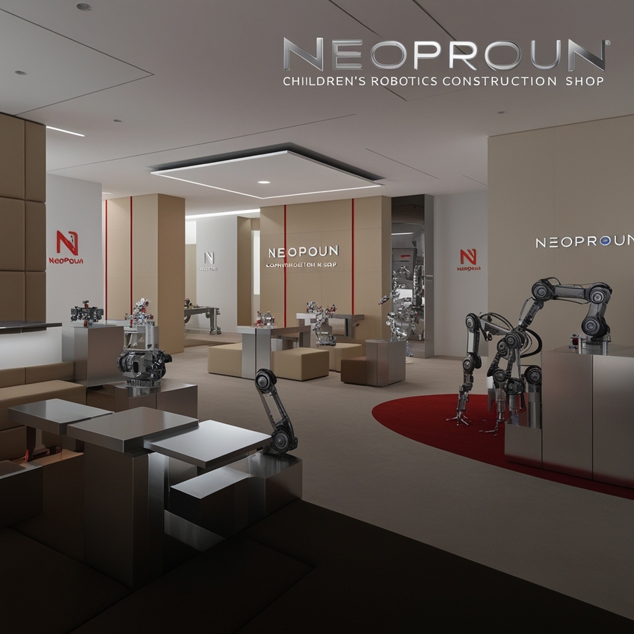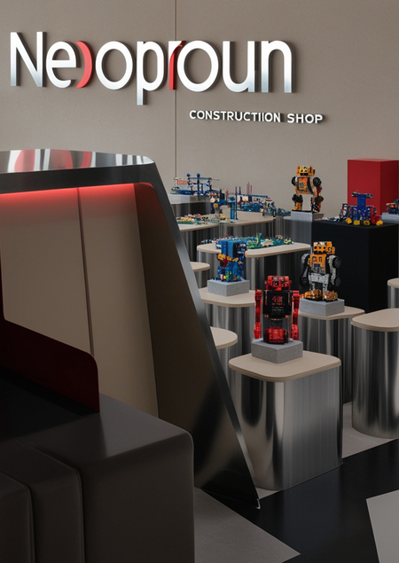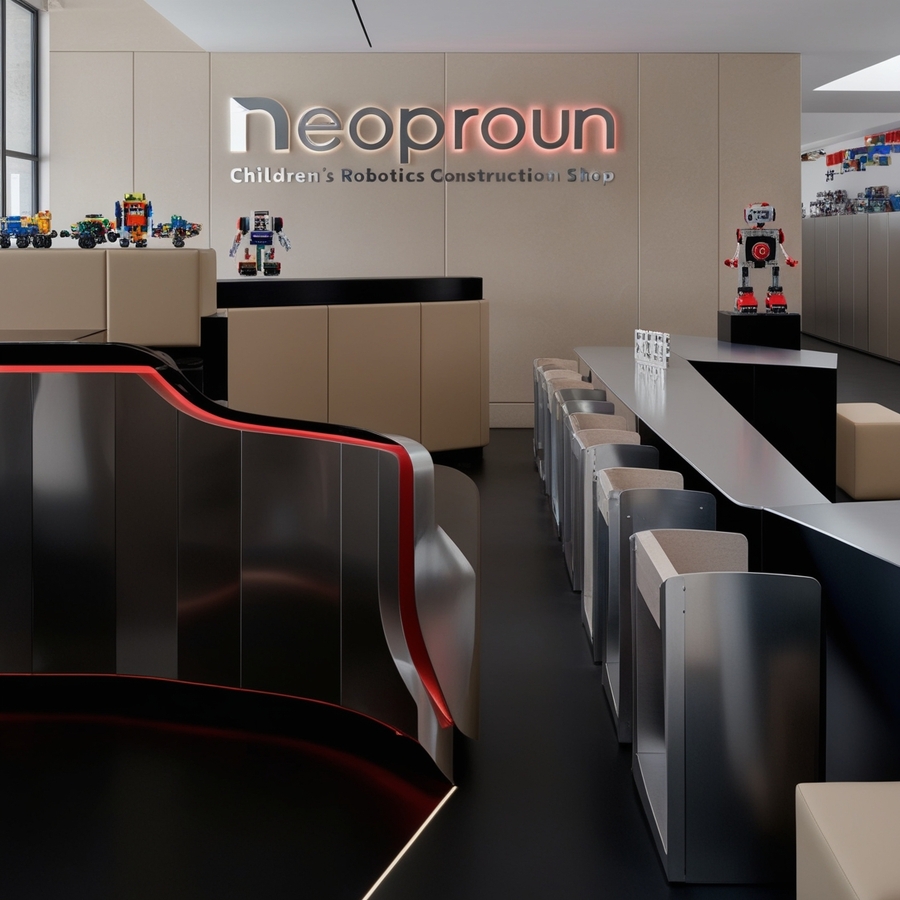 Create a modern interior for a children’s constructor shop for robotics, use beige, silver and red colours, name ‘’NEOPROUN‘’, minimalism