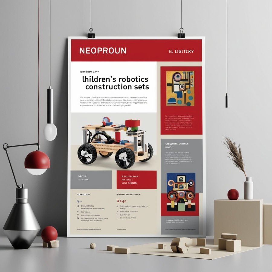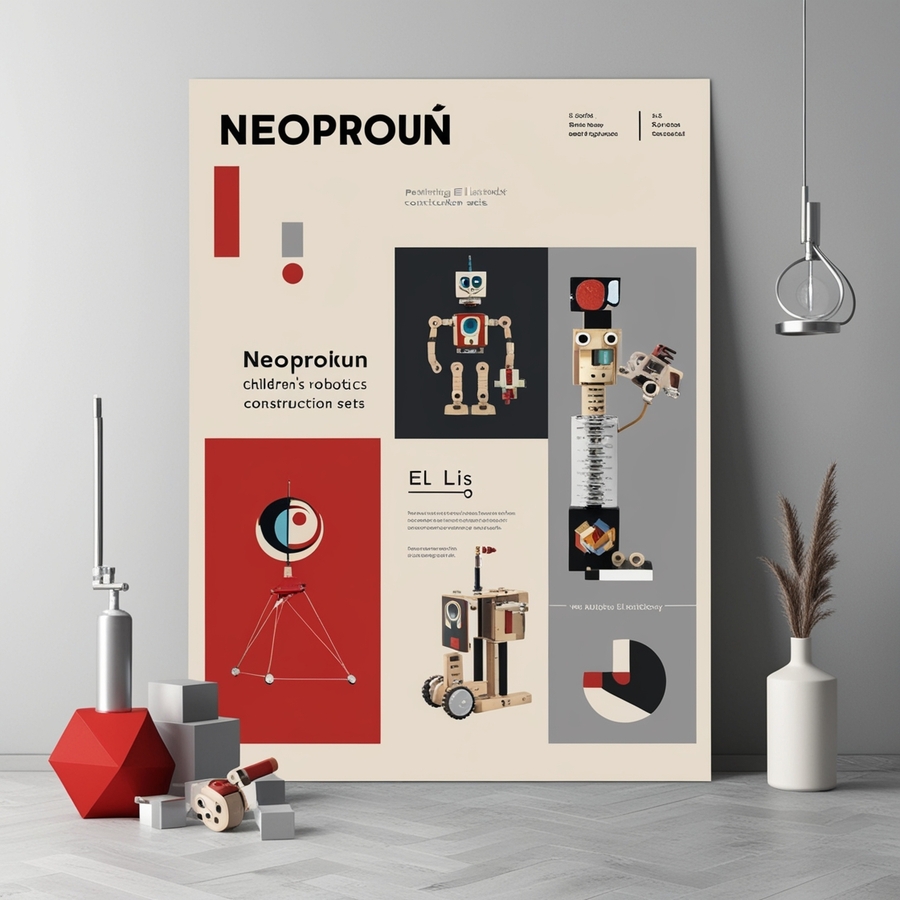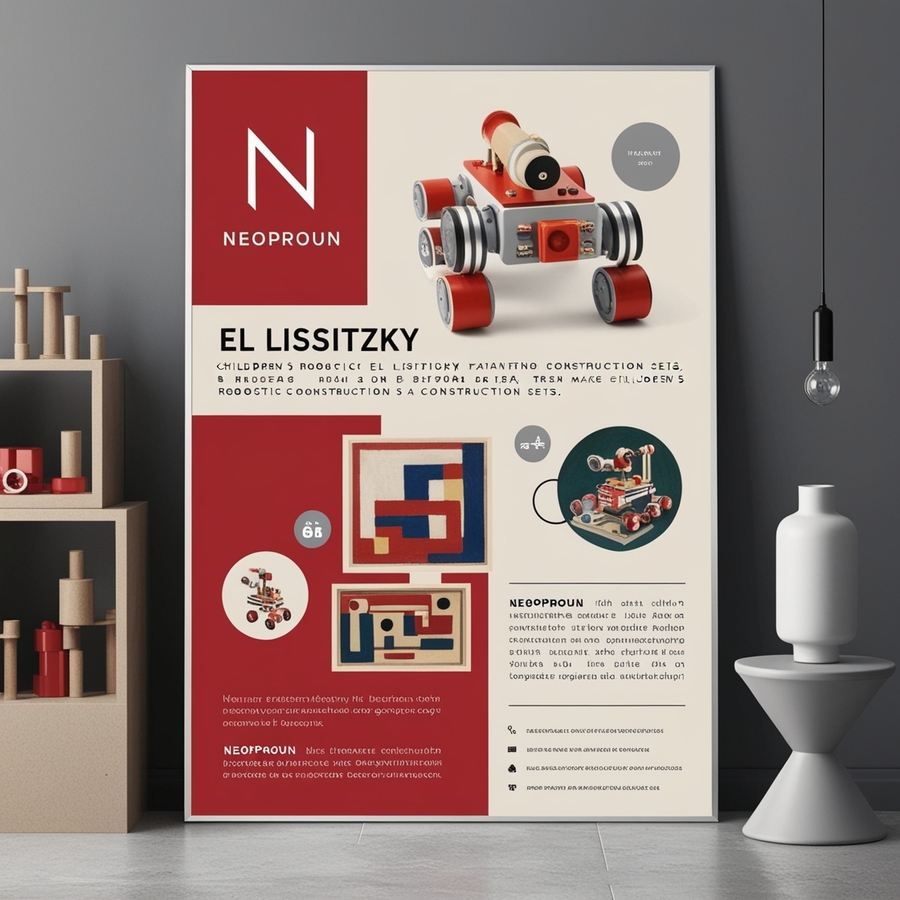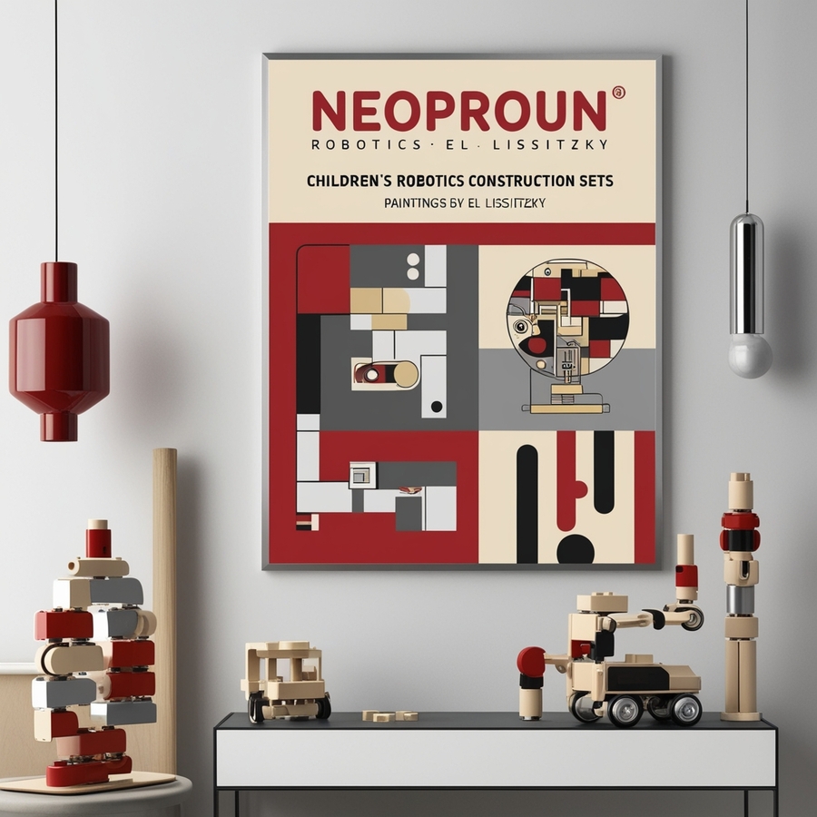 Create a modern minimalistic poster for а company named «NEOPROUN» that makes children’s robotics construction sets, the poster features paintings by El Lissitzky. Use red, silver and beige tones, a strict and modern style with infographics and headlines