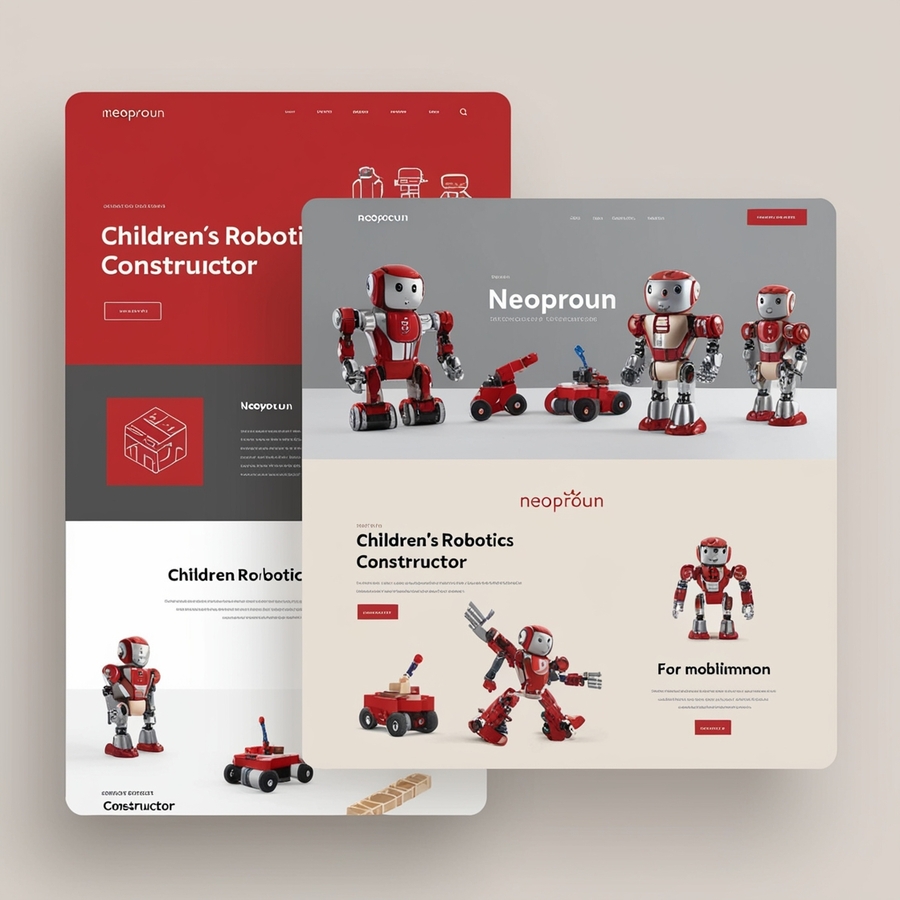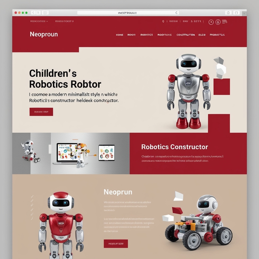 Create a modern minimalistic advertising website for a company producing children’s robotics constructor. you can use red, silver and beige tones, strict and modern style with infographics and headlines ‘NEOPROUN’ / for mobile version