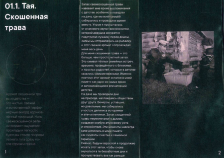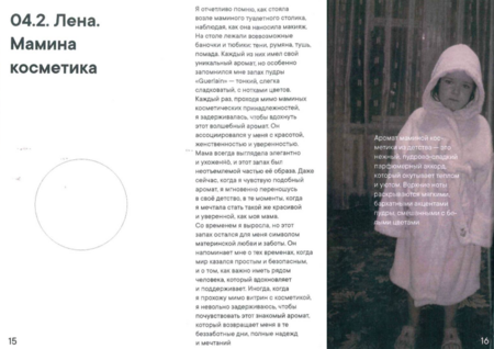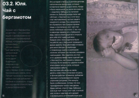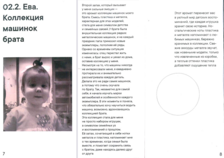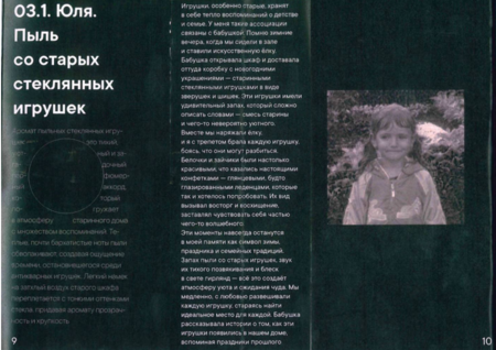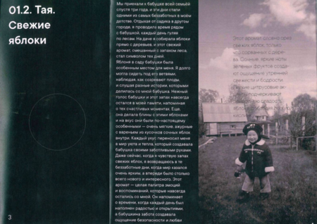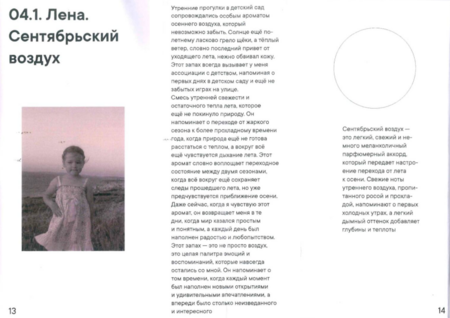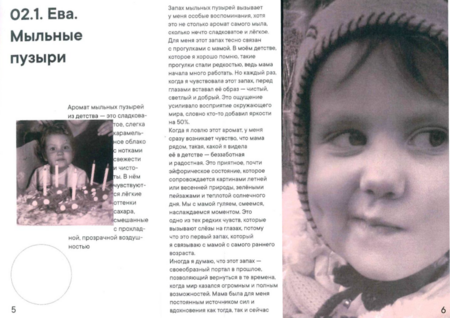 Зин посвящён выходу коллекции ароматов, связанных с воспоминаниями людей из их детства. Каждый разворот посвящён отдельному человеку и рассказывает его историю, связанную с этим ароматом, который можно почувствовать, потерев страничку — прямо как в журналах из нашего детства