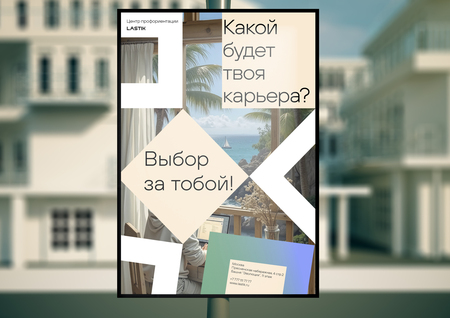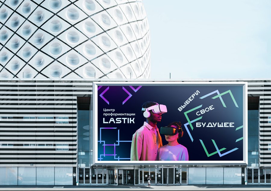 Центр профориентации Lastik — это своего рода «портал в будущее», помогающий молодым людям строить жизнь, о которой они мечтают. Серии плакатов, посвященных различным инфоповодам, по-разному раскрывают стиль бренда — яркий, динамичный, именно таким может быть будущее, лаконичный и уверенный, ведь выбор будущего в наших руках.