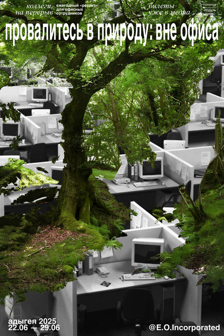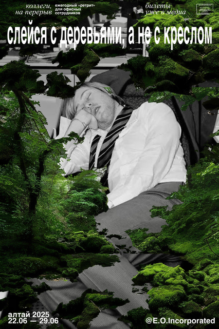 Следующая серия плакатов посвящена ретриту для офисных сотрудников. Основной визуальный акцент — это текстуры природы, которые проваливаются в офисный интерьер.