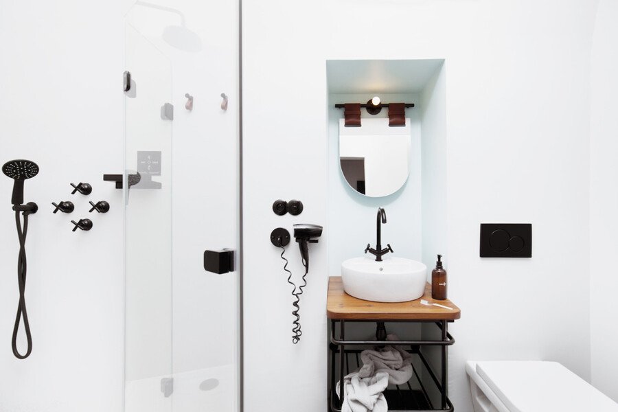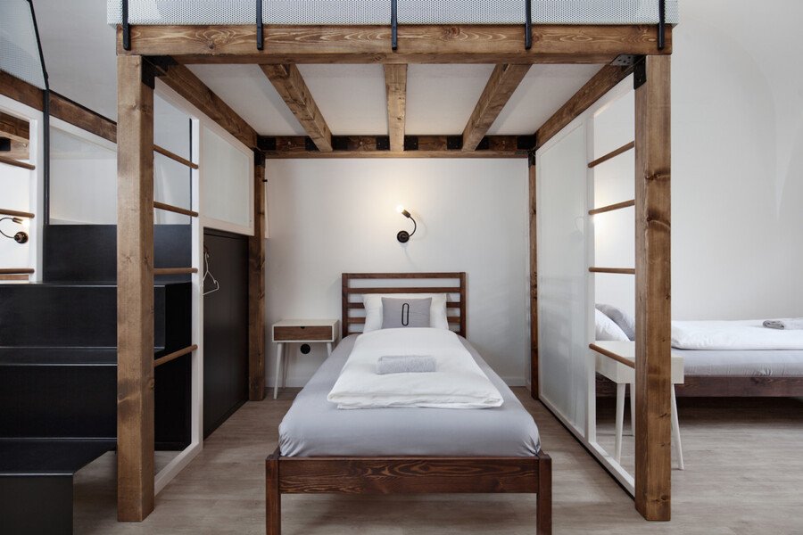 Команда работала над хостелом два года и выбрала мягкую пастельную цветовую палитру. Большая часть современной мебели сделана на заказ. Кровати, зеркала, лампы, полки и ванная комната были изготовлены по индивидуальным размерам местными мастерами.