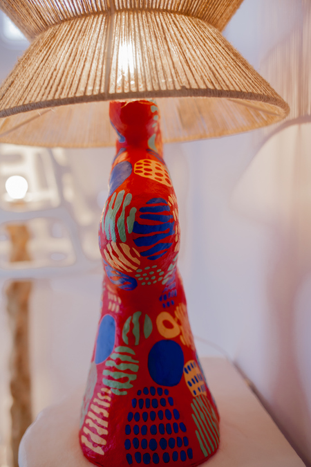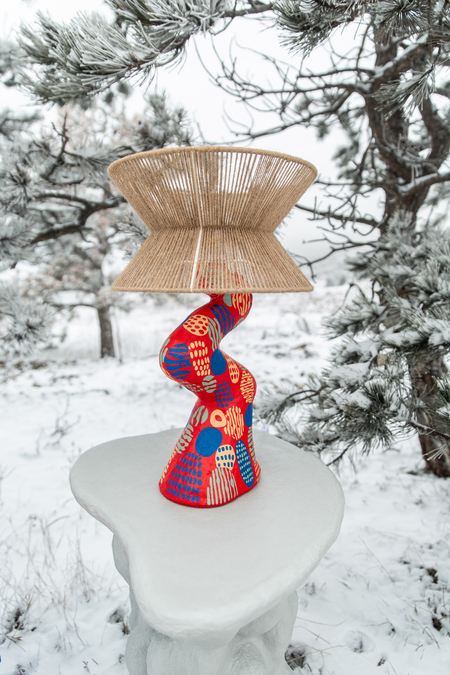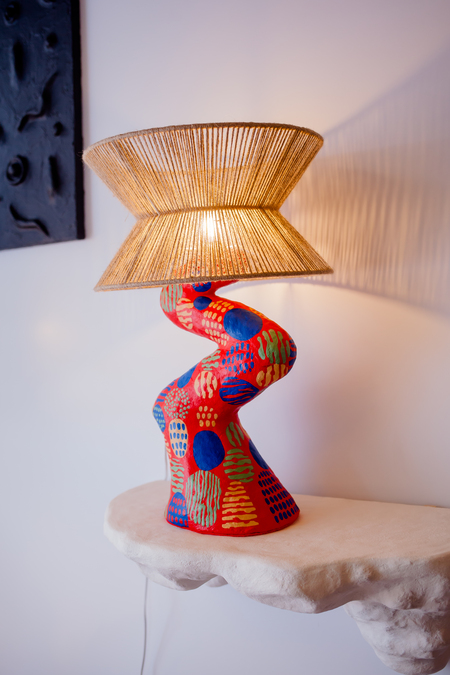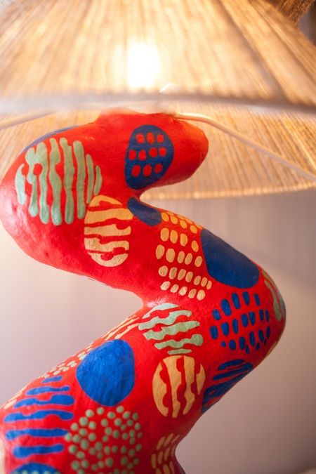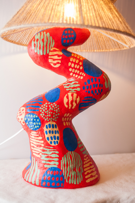 This is how this lamp appeared: the sinuous shape resembles the figure of a camel, and the bright print is unique Marrakesh.