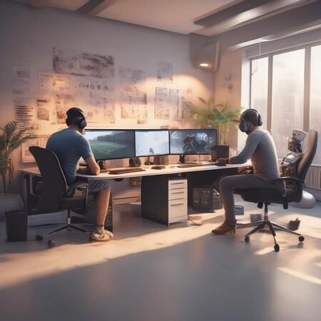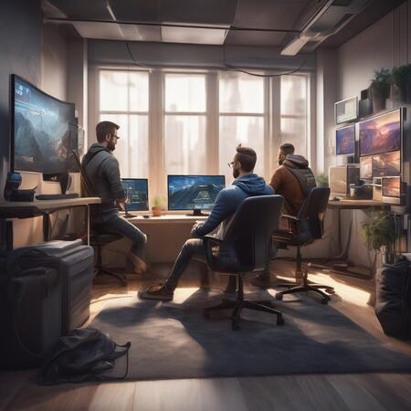 Промпт: A comfortable office room for a real game developer company with 3 people sitting in front of their modern computers. Ultrarealistic picture.