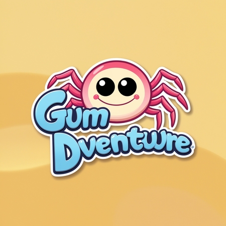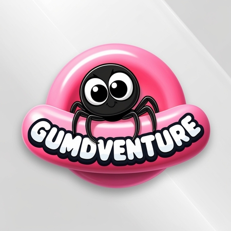 Промпт: Logo for a 2d video game platofrmer with a cute spider with big eyes and a text «GumDventure» with a pink bubble gum around the text. The bubble gum must have a simple shape with no patterns and details.