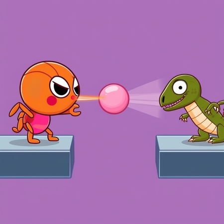 Промпты: 1. A 2D side-scrolling platformer game featuring a spider character that shoots a small ball of chewing gum. The spider stands on a platform on the left side of the frame, aiming and shooting a wad of gum at a lizard-like enemy on a platform on the right side of the frame. The lizard is the same size as the spider and is facing towards the spider. The art style should be cute, 2D, and without shadows. The spider has only 4 limbs and is colored in bright orange and pink colors.