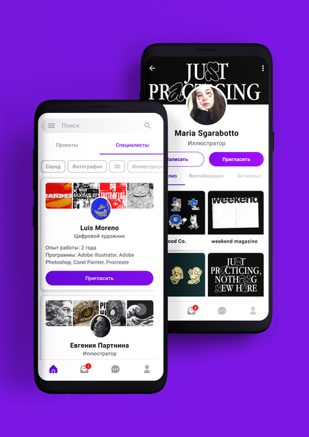 collart — приложение, которое благодаря возможностям отклика и приглашения в проекты помогает специалистам креативных индустрий находить человека из другой творческой сферы для совместной работы