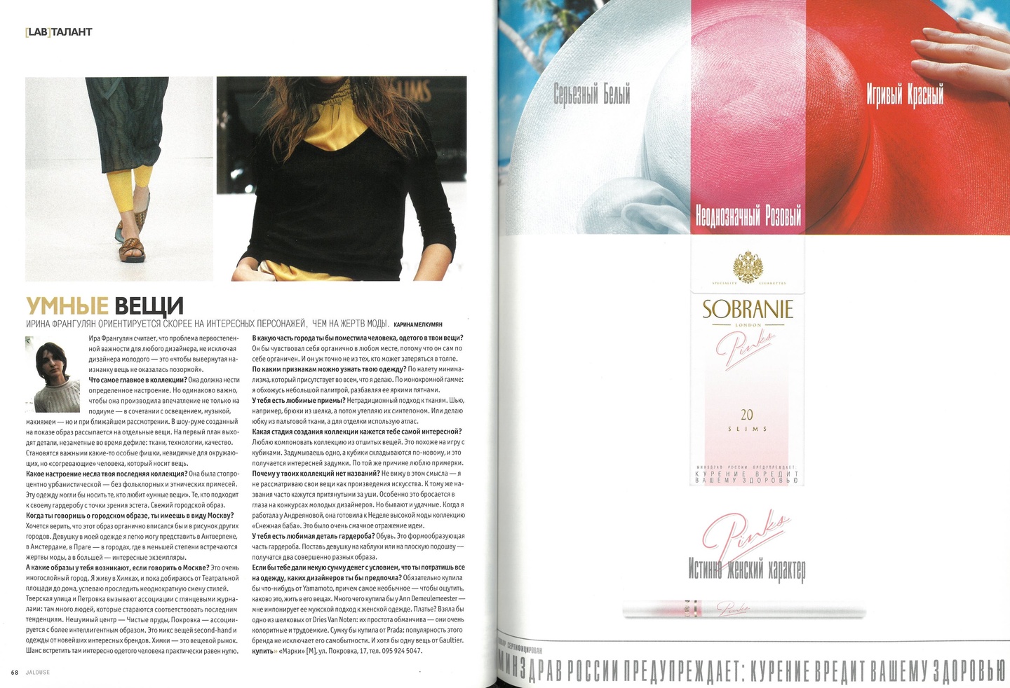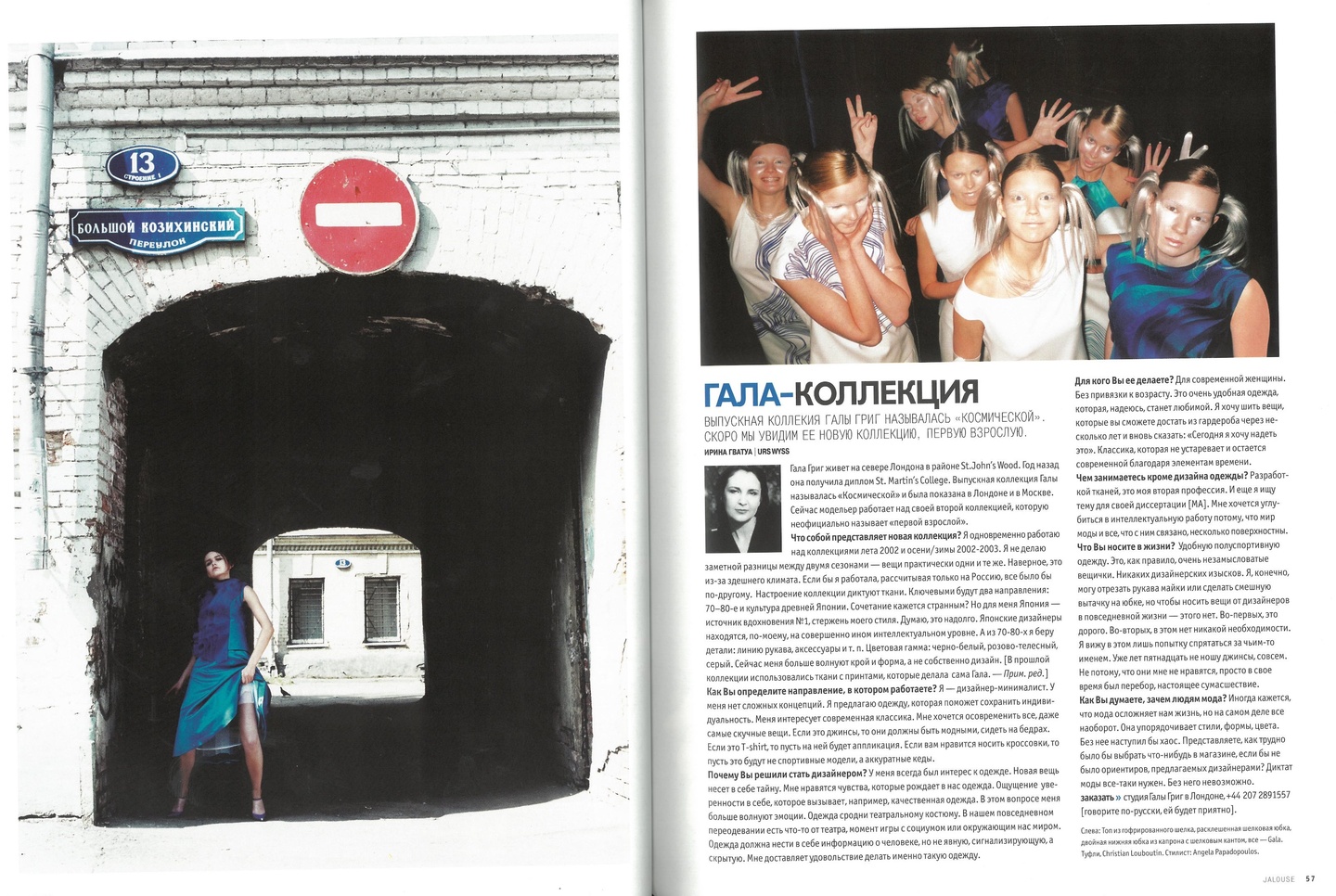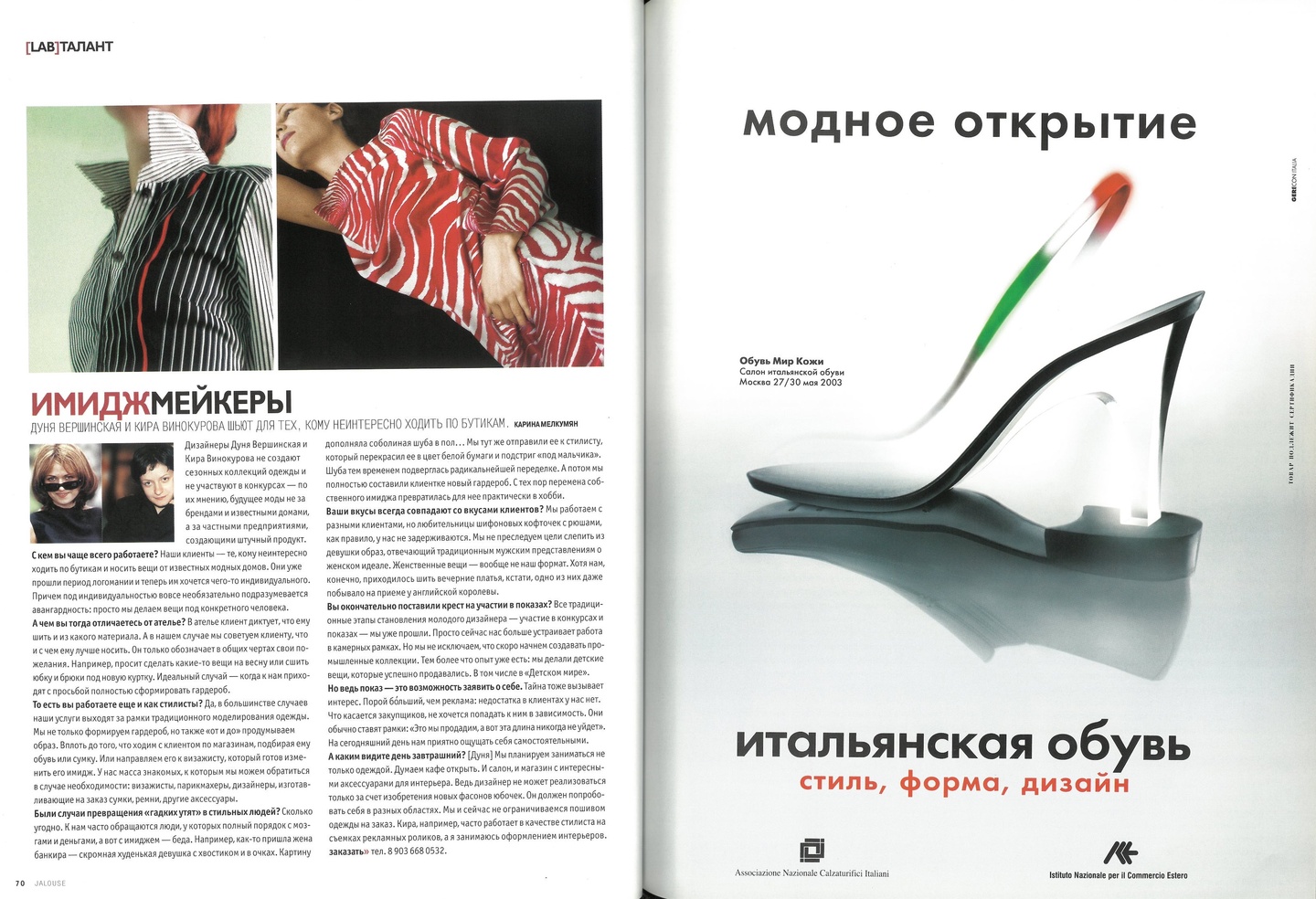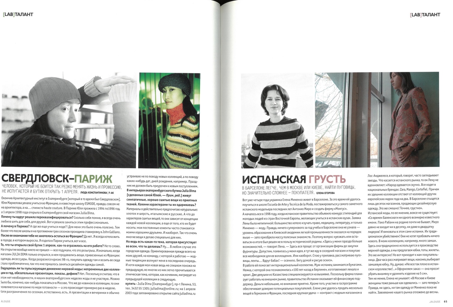 Интервью с дизайнерами: Ирина Франгулян, Дуня Вершинская и Кира Винокурова, Алла Ельчанинова и Илона Гайдай, Екатерина Филиппова, Женя Бирюкова и Ира Великанова (все Россия) в Jalouse, апрель 2003