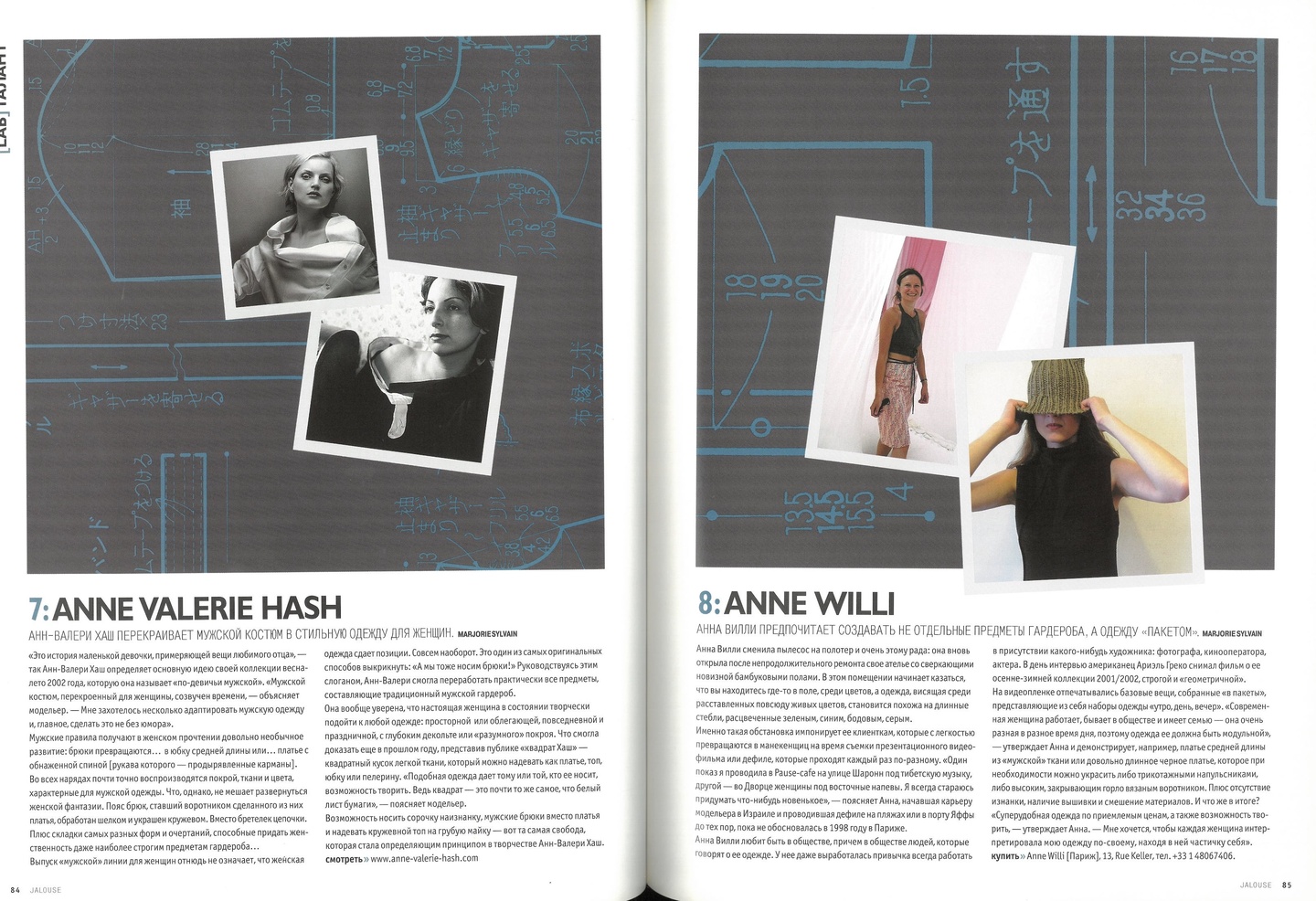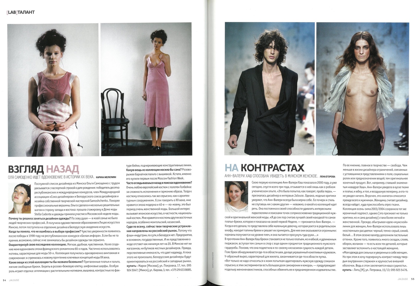 Интервью с дизайнерами: Оля Самощенко (Россия), Анн-Валери Хаш (Франция), Йошики Шихинума (Япония), Светлана и Елена Ватанины (Россия) в Jalouse, сентябрь 2003