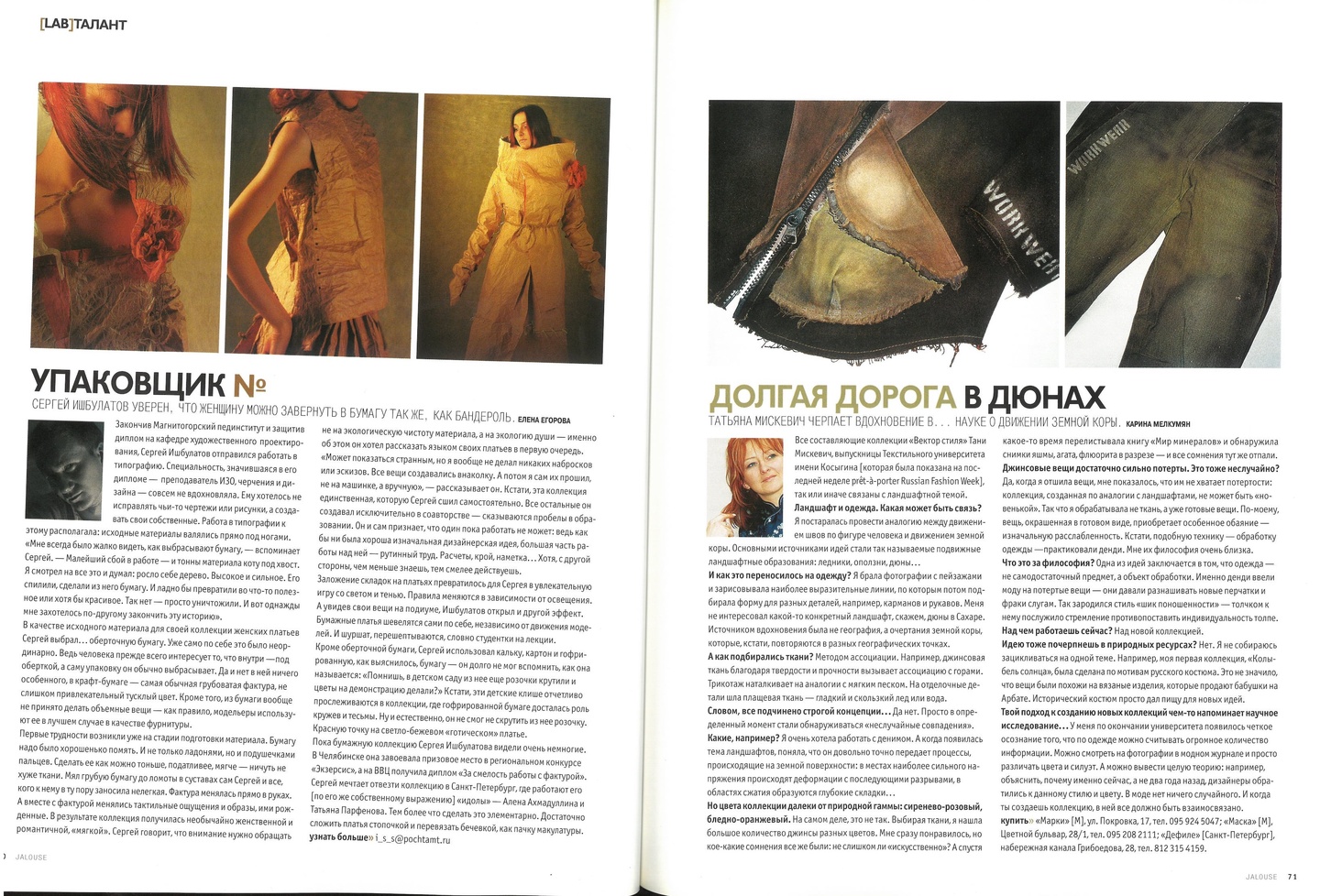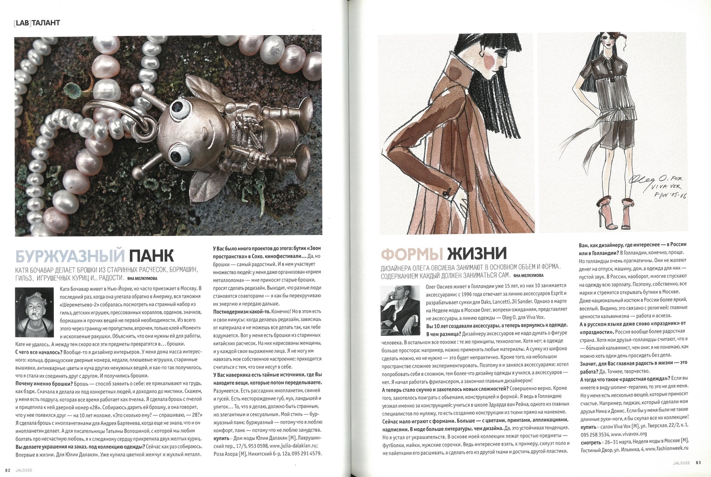 Интервью с дизайнерами: Катя Бочавар (Россия) и Олег Овсиев (Россия, Голландия), Ирина Зима (Россия) в Jalouse, март 2005