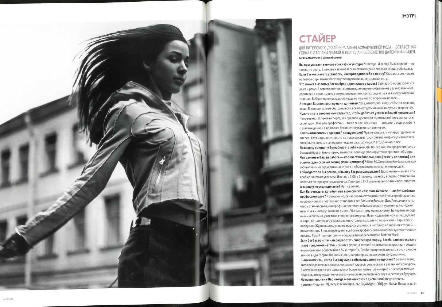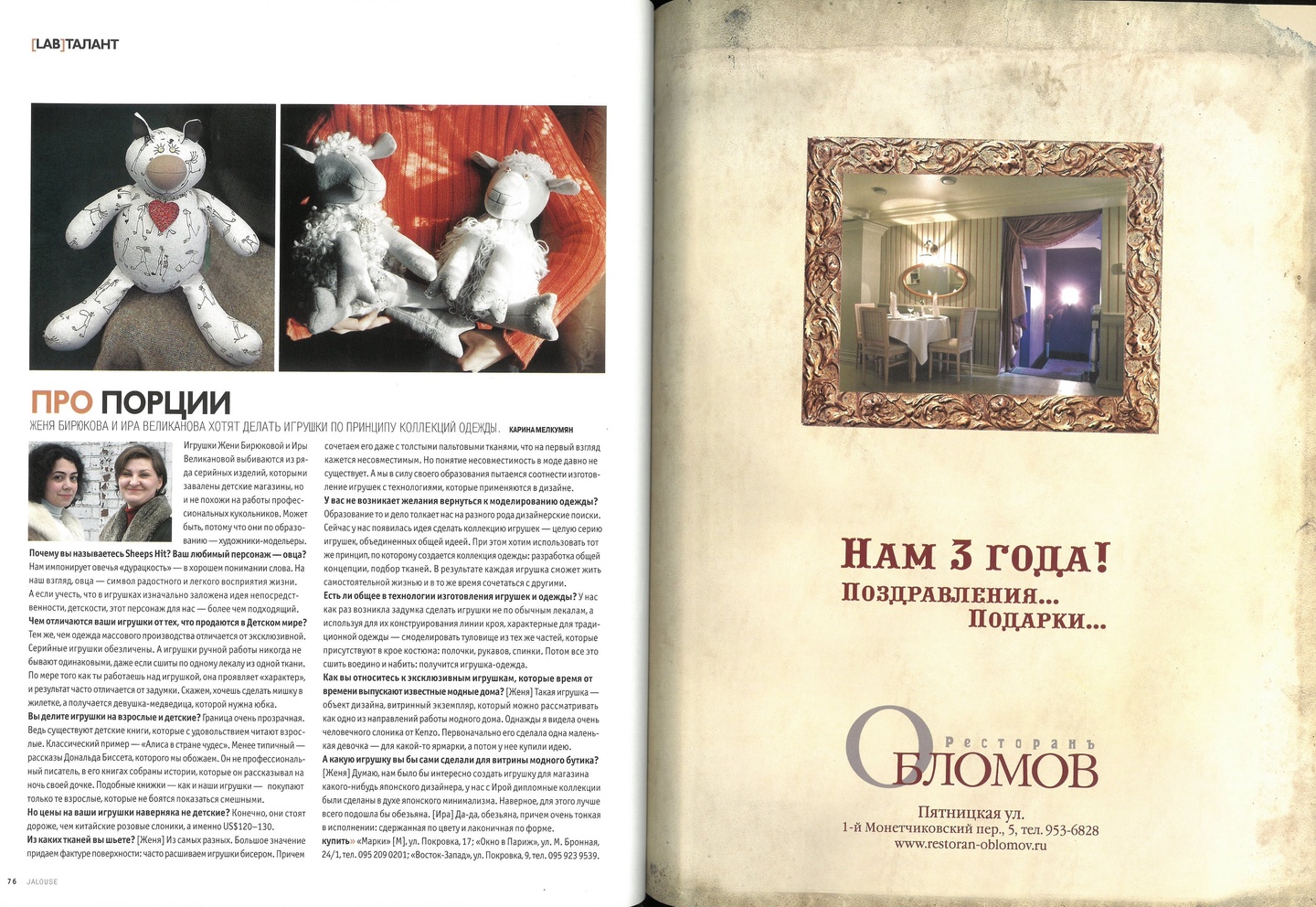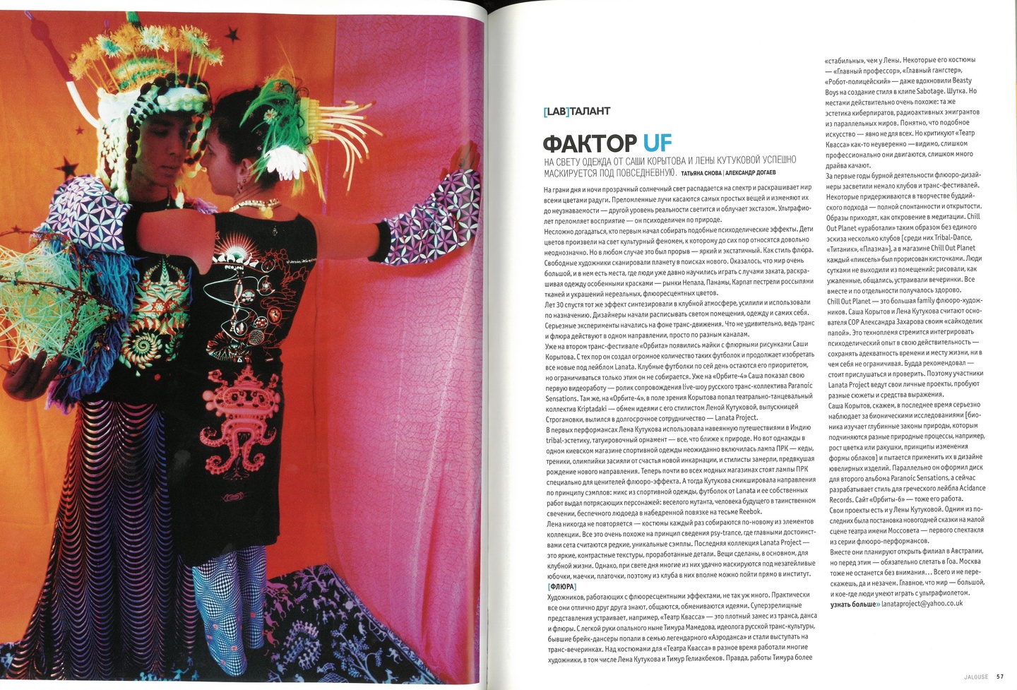 «На следующих 45 страницах лаборанты Jalouse расскажут о своих наблюдениях за новыми и необычными явлениями в исследуемых ими областях: музыке, кино, театре, интернете, искусстве, спорте, дизайне, сексе… здесь же — опыты молодых российских и зарубежных модельеров, фото-графов, стилистов — тех, кто, по мнению Jalouse будет делать моду XXI века.»