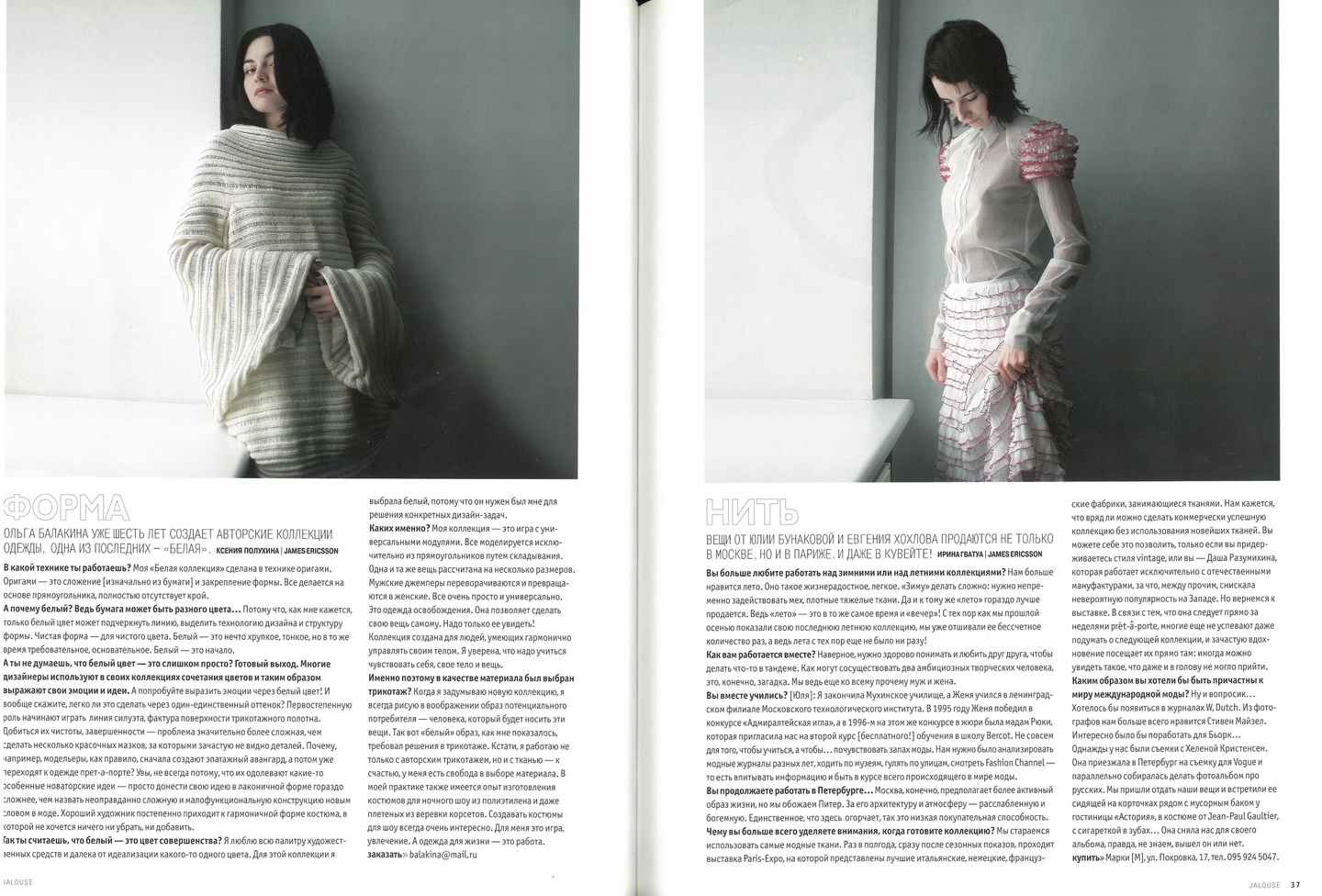 Интервью с дизайнерами: Ольга Балакина (Россия), Юлия Бунакова и Евгений Хохлов (Россия), Лена Квадрат (Россия) в Jalouse, март 2002