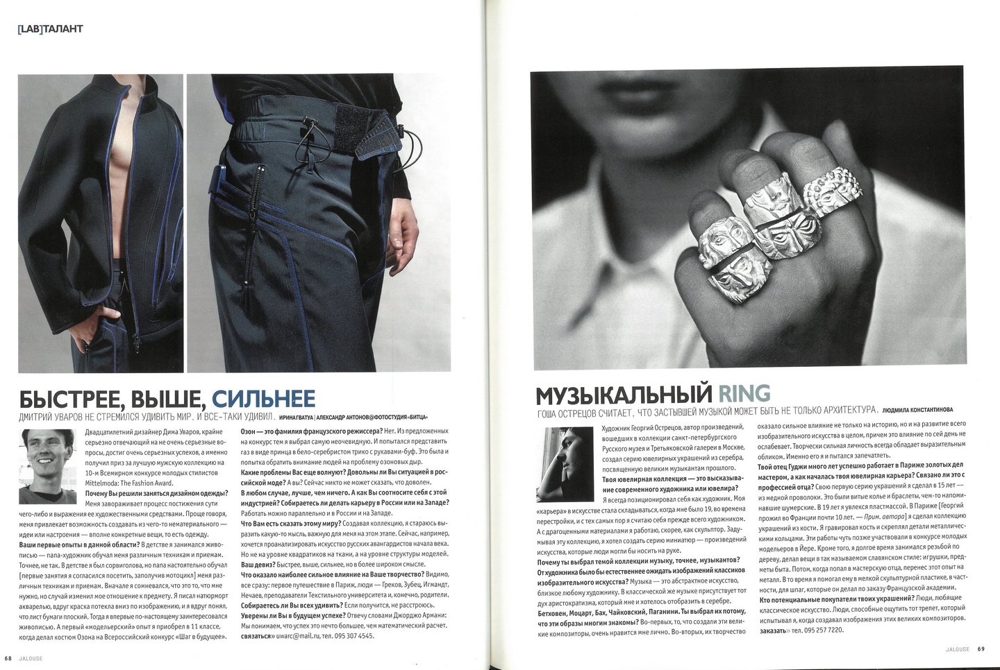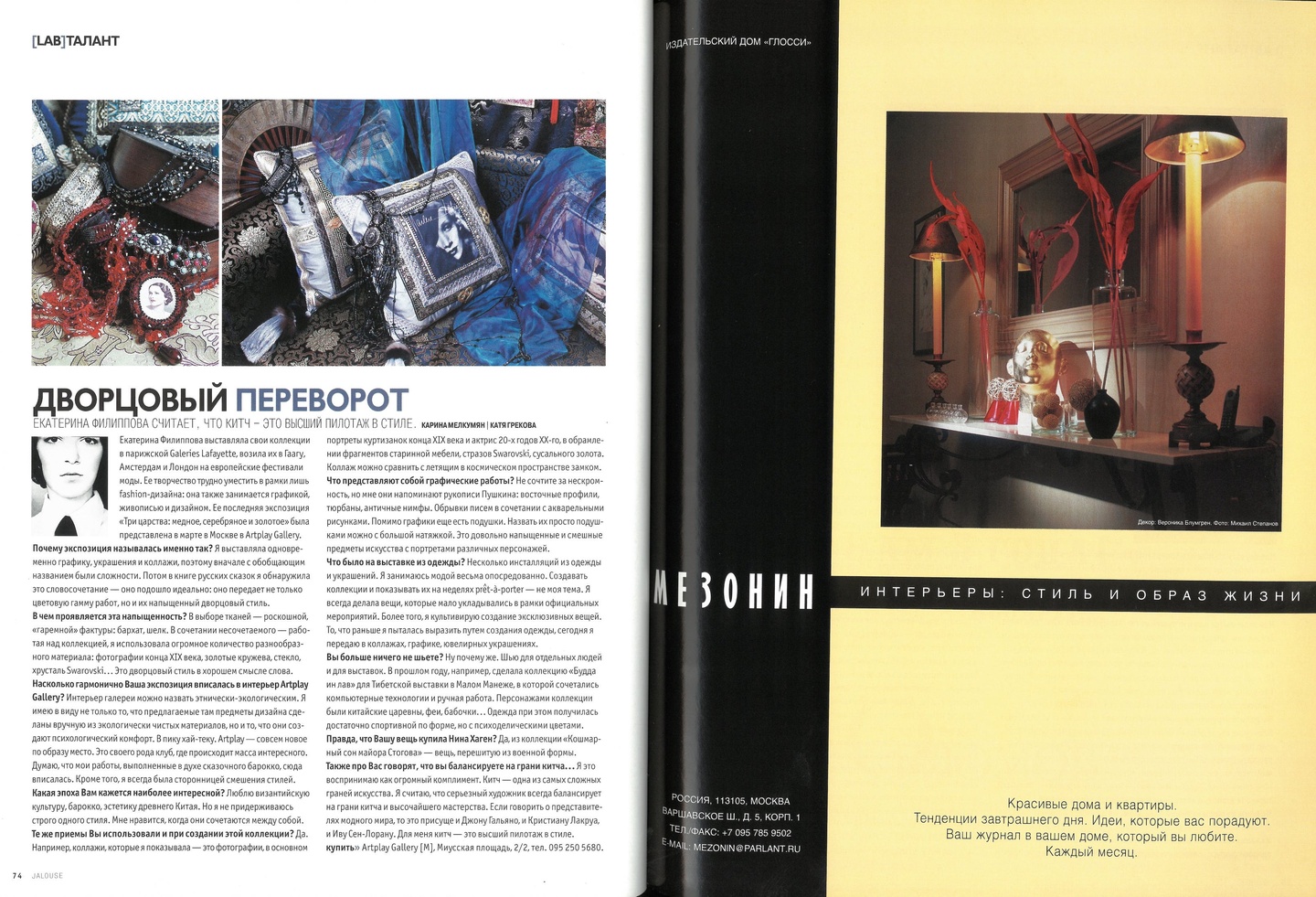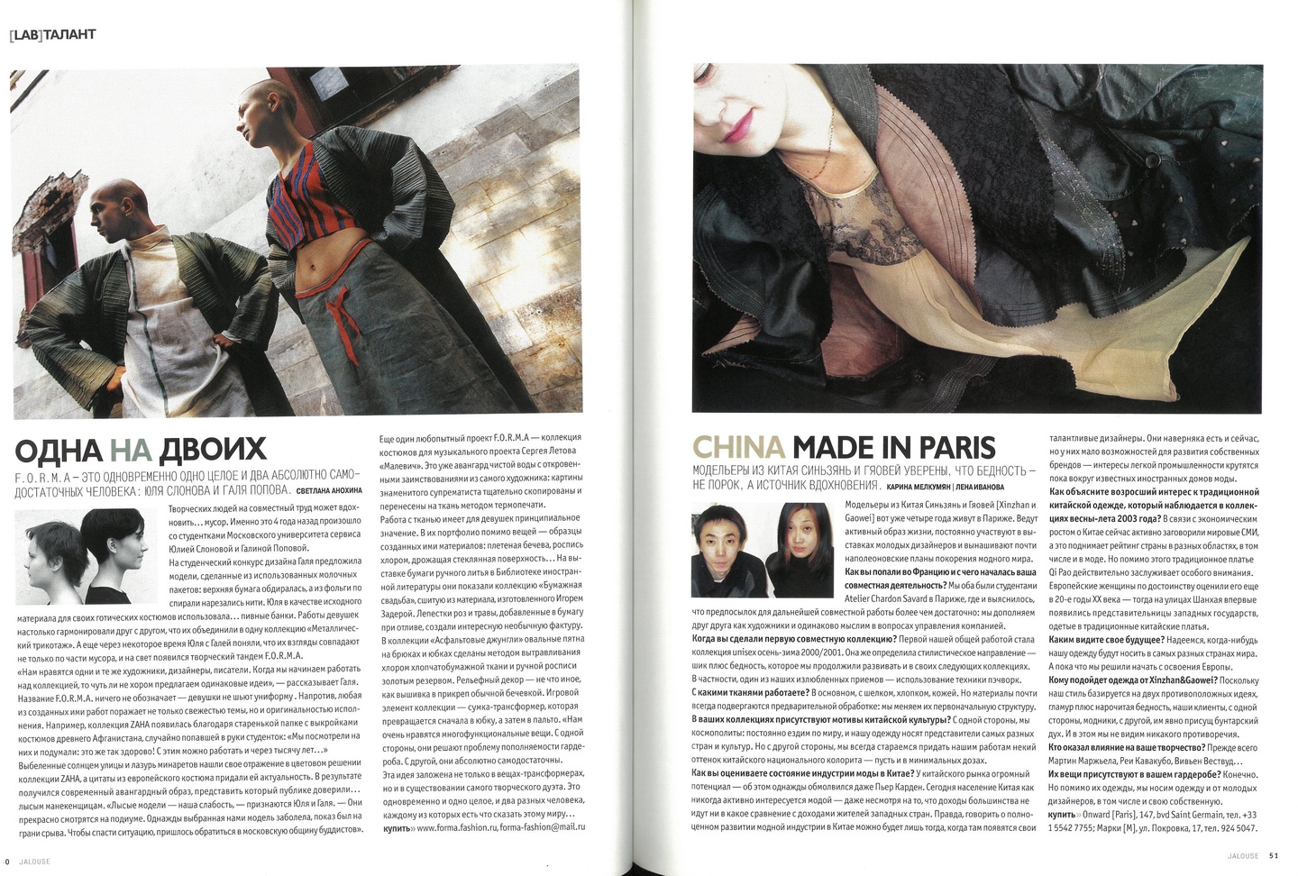 Интервью с дизайнерами: Юия Слонова и Галина Попова (Россия), Синьзянь и Гяовей (Китай), Алексей Барсуков (Россия) в Jalouse, июль–август 2003