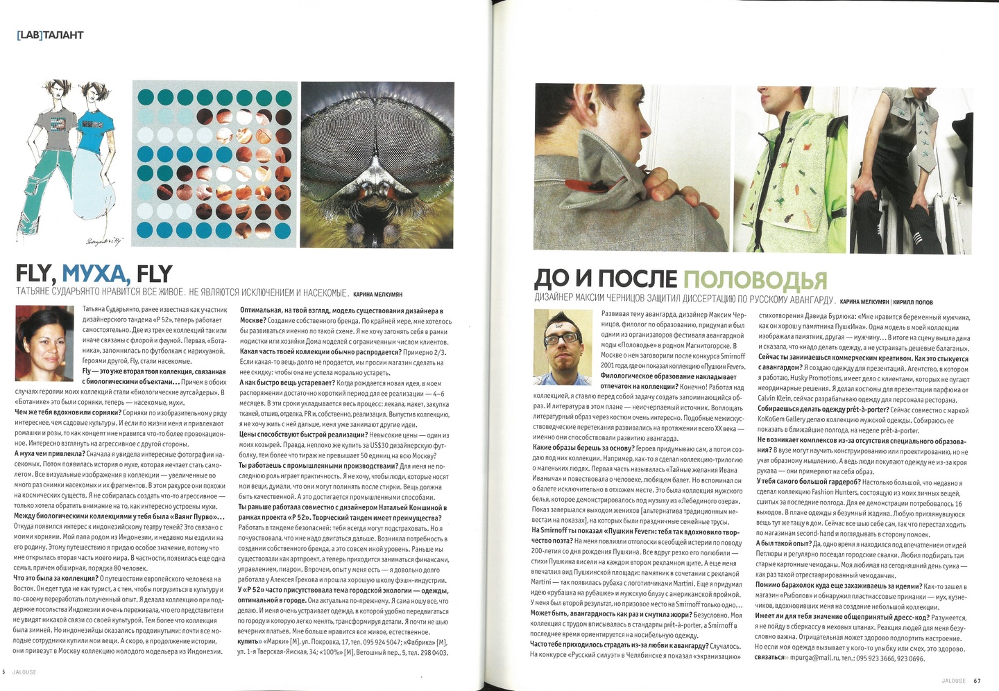 Интервью с дизайнерами: Татьяна Сударьянто, Максим Черницов, Дмитрий Уваров, Гоша Острецов, Сергей Ишбулатов, Татьяна Мискевич (все Россия) в Jalouse, март 2003