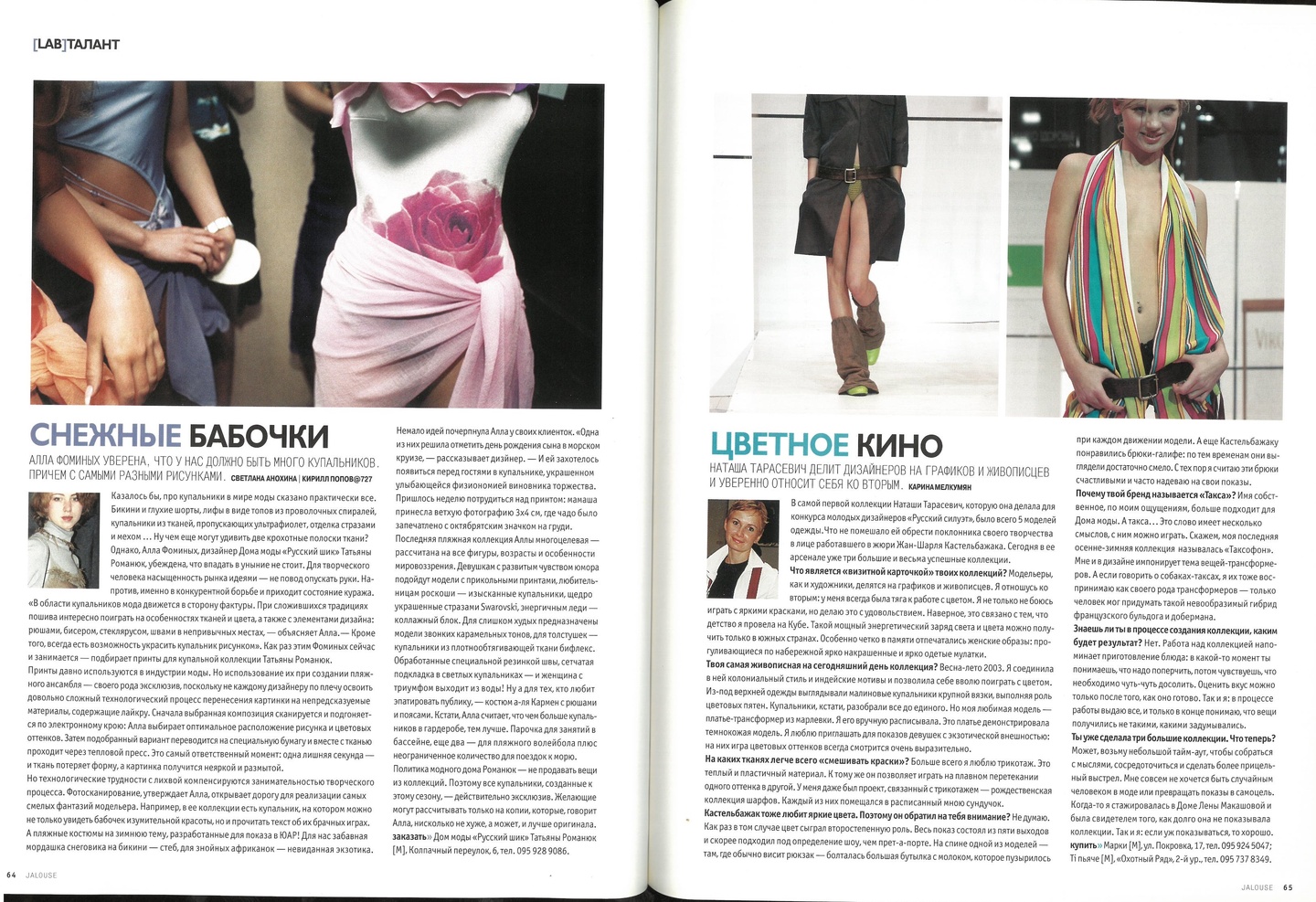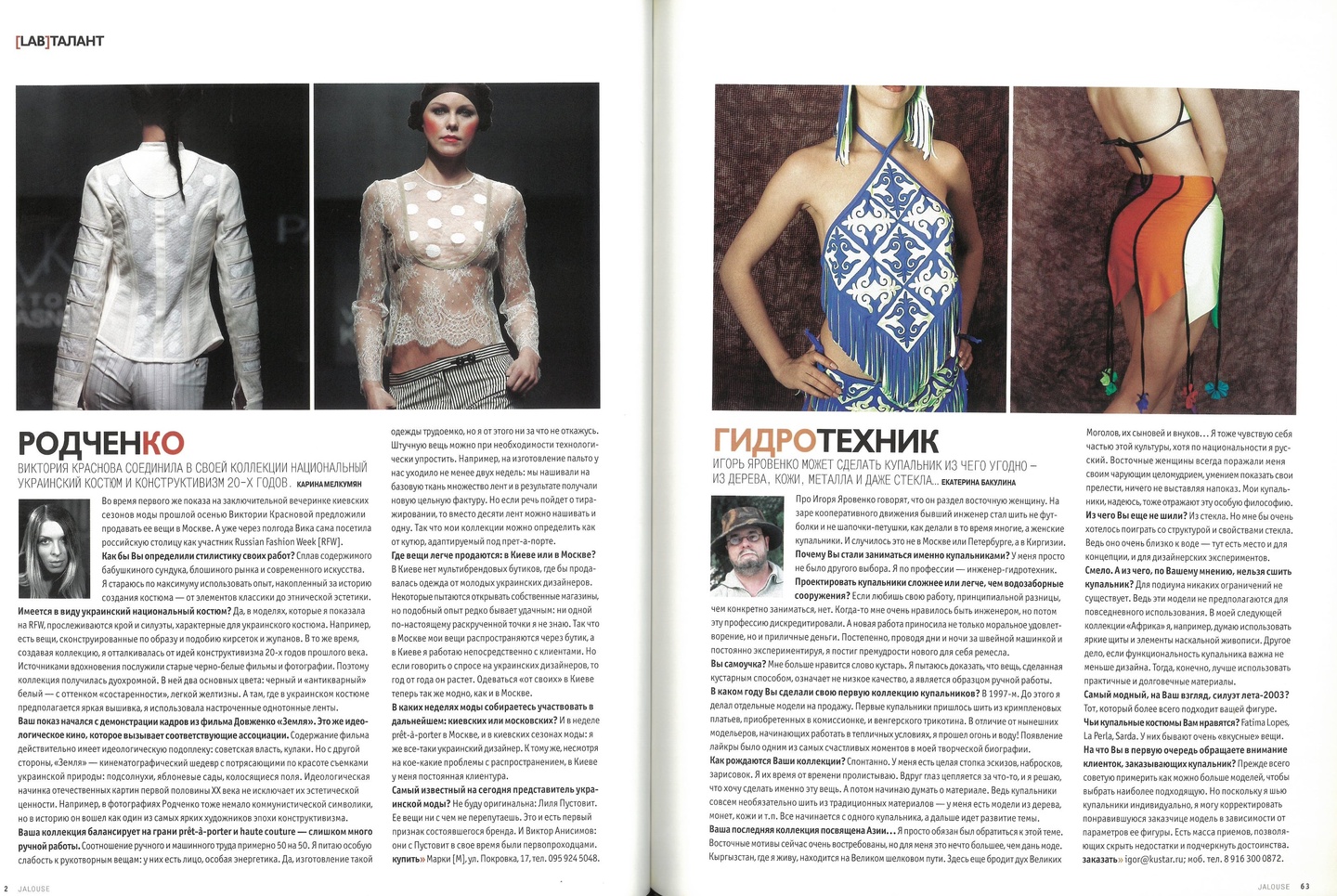 Интервью с дизайнерами: Виктория Краснова, Игорь Яровенко, Алла Фоминых, Наташа Тарасевич (все Россия) в Jalouse, июнь 2003