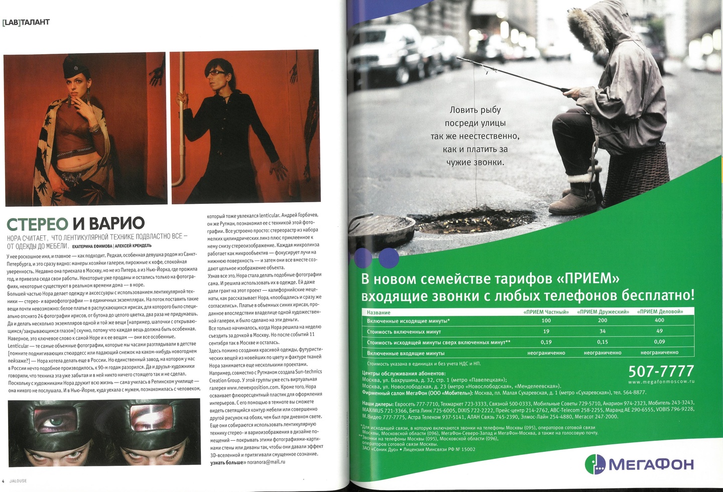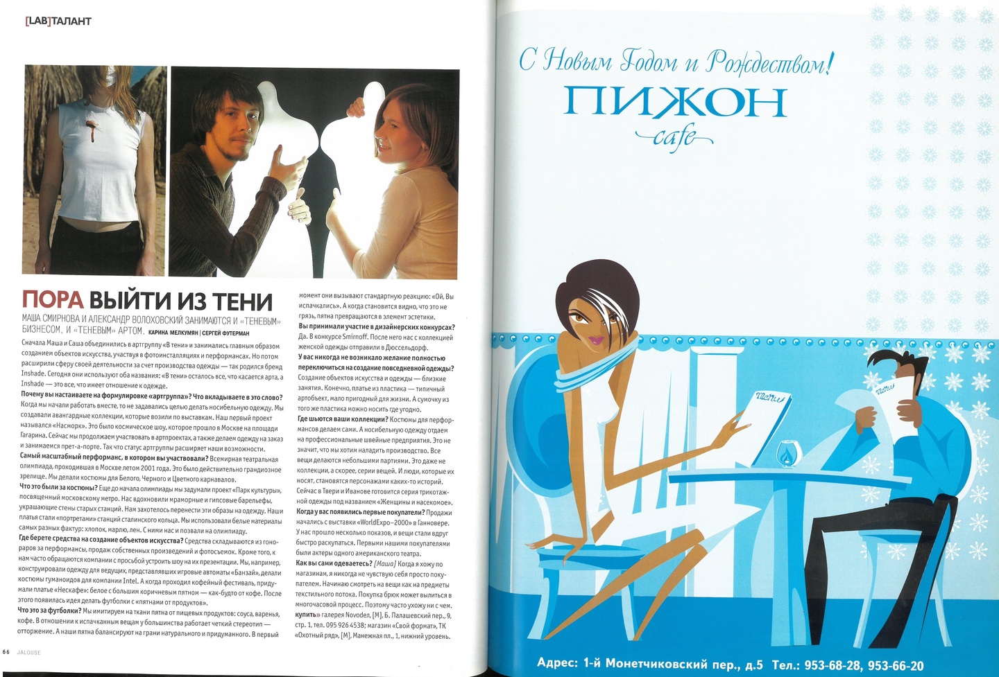 Интервью с дизайнерами: «В тени» Марии Смирновой и Александра Волоховского (Россия), Дмитрий Шевела, Наталья Романова и Наталия Фролова (Россия), Нора (Россия), в Jalouse, декабрь–январь 2002-2003