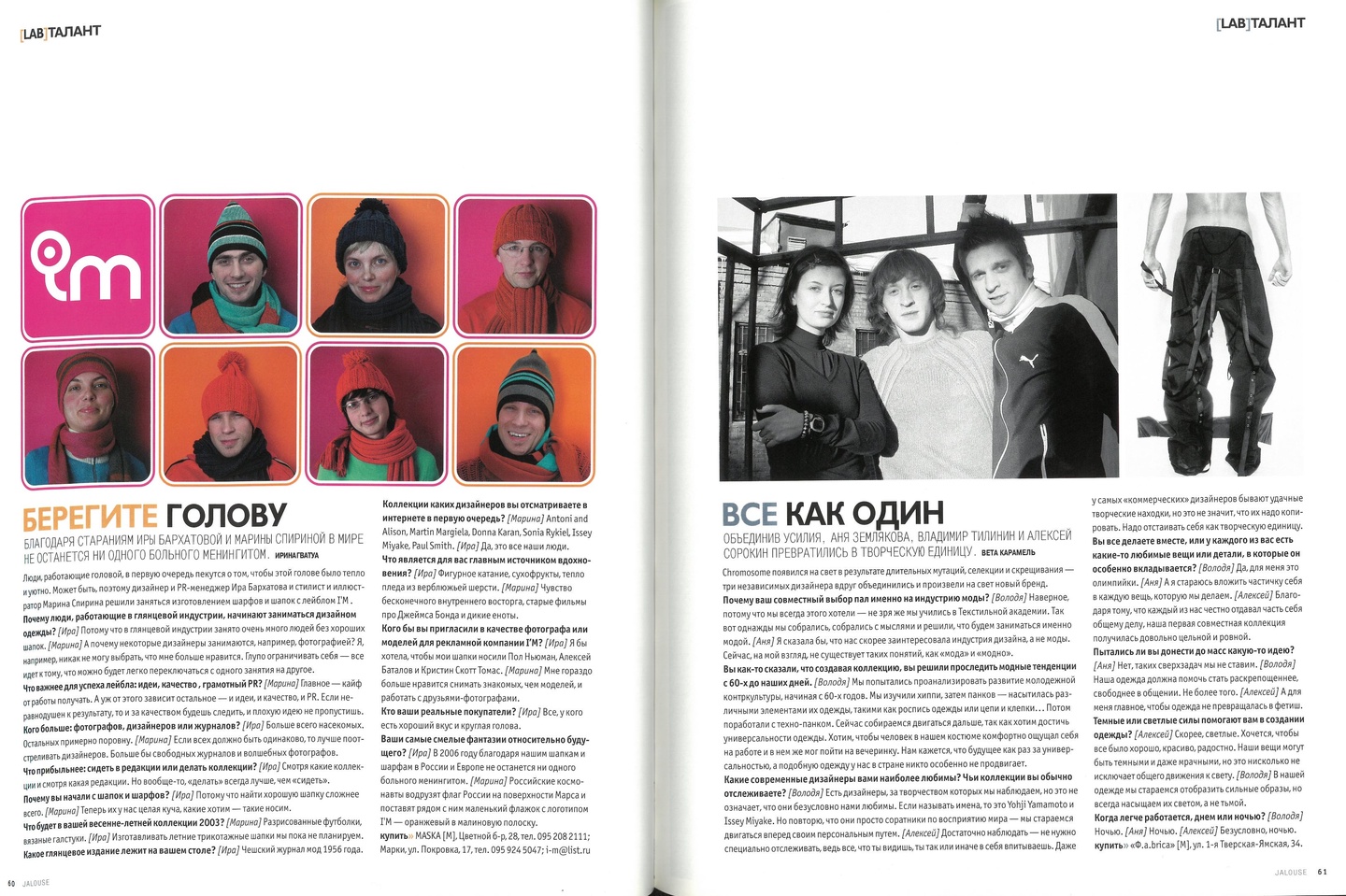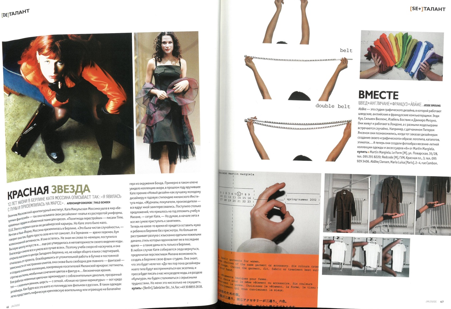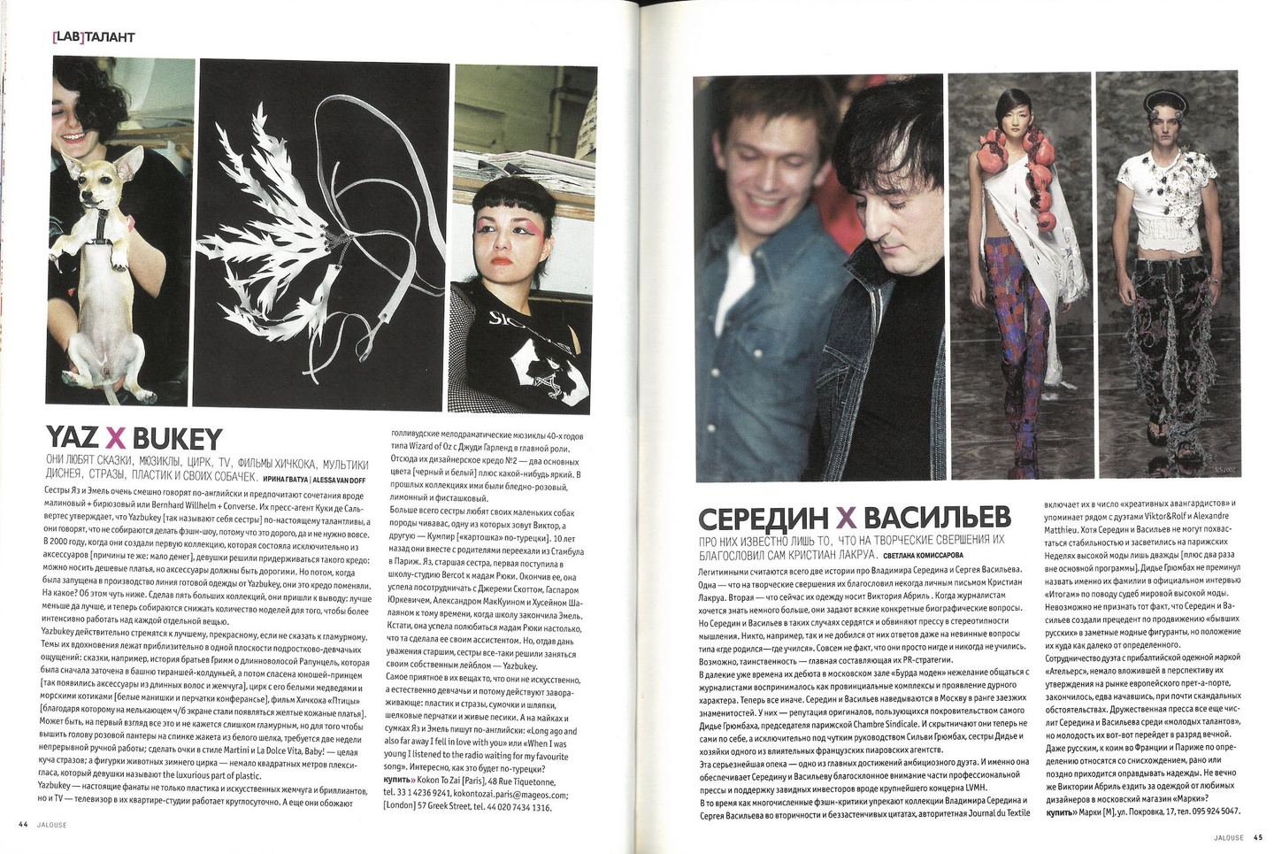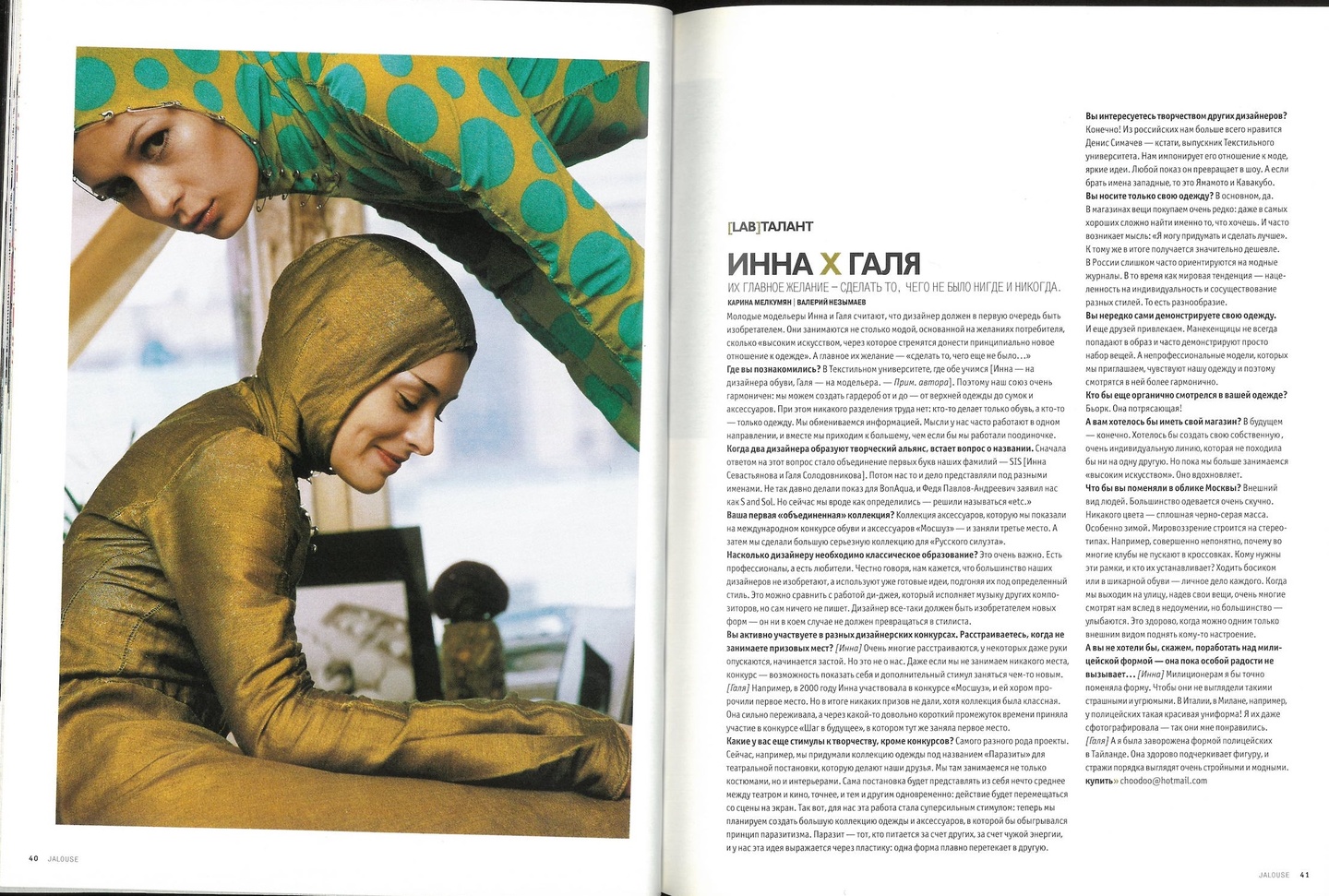 Интервью с дизайнерами: Инна и Галя (Россия), Яз и Эмель (Франция), Середин и Васильев (Россия) в Jalouse, июль–август 2002