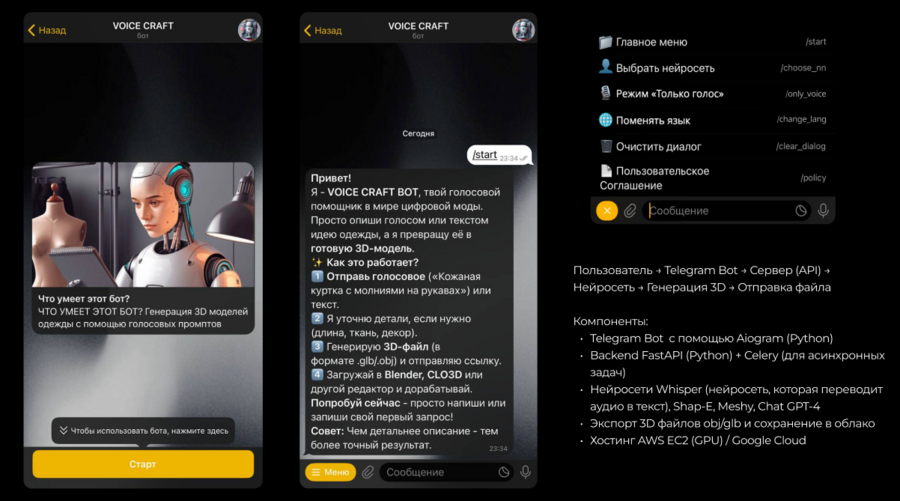 Концепцией проекта является создание Telegram Бота, который с помощью текстового или голосового промпта генерирует 3д модели одежды