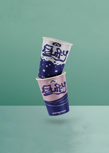 В поисках идеи для бумажного стаканчика кофе, возник образ чего-то мягкого и уютного, как горячая чашка кофе в холодную осеннюю погоду. «Fluffy» (с англ. пушистый). Большое количество молочной пены в напитке ассоциируется с пушистым облаком, которое расслабляет, тогда когда это необходимо. В процессе разработки, возникла идея изображения разных по составу кофейных напитков: Эспрессо, Латте и Холодный кофе. Их особенности и были изображены на упаковке: воздушная молочная пена напоминающее облако из множества пузырьков, льдинки и снежинки дарящие свежесть и ощущение зимней прохлады, и темный, строгий кофе без каких-либо добавок.