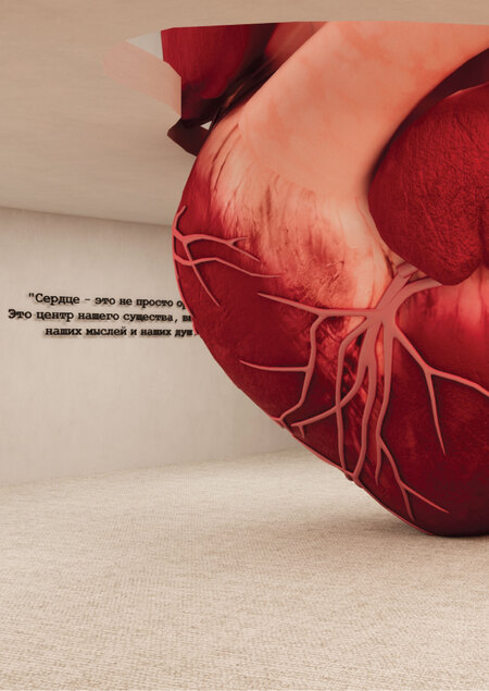 Промт: improve the picture, the exhibition hall is in a minimalist style, there is light carpet on the floor, the ceiling is white, the walls are red brown, there is a hole in the ceiling. A huge biological heart the size of 2 floors passes through a hole. There are paintings on the walls on the theme of the heart as an organ.make it more detailed