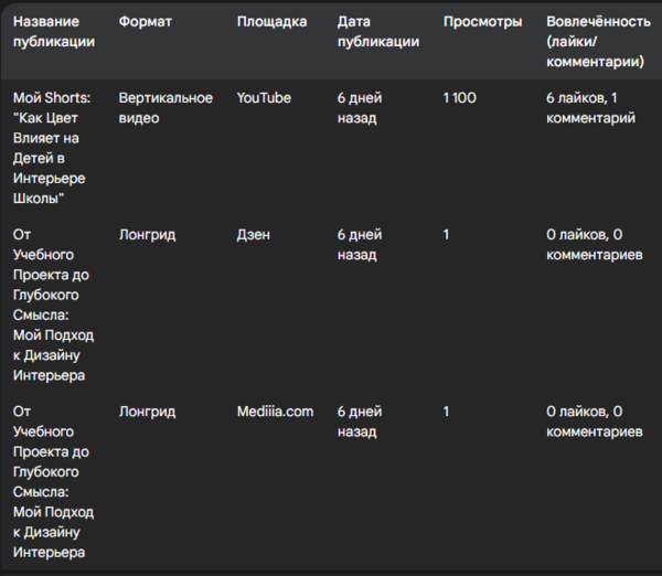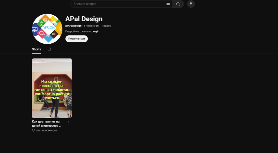 Формат коротких вертикальных видео («Shorts») — мой основной инсайт. Он доказал свою эффективность для быстрого и широкого охвата. Тема «влияние цвета на детей в интерьере школы» в визуальной подаче оказалась очень востребованной, что подтверждается количеством просмотров.