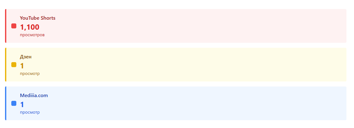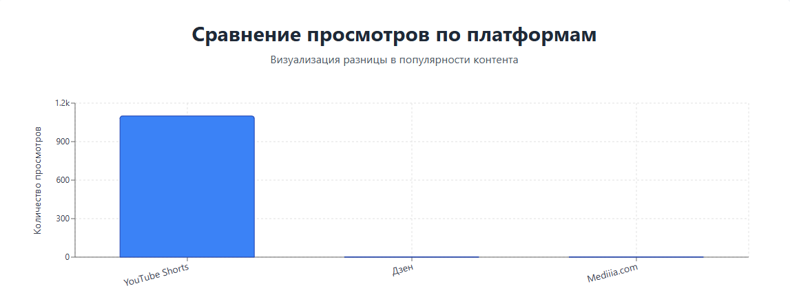 Ключевые выводы: • YouTube Shorts демонстрирует исключительную эффективность с 1,100 просмотрами • Дзен и Mediiia.com показывают минимальную активность • Разница в просмотрах составляет 1,100:1 в пользу YouTube Shorts