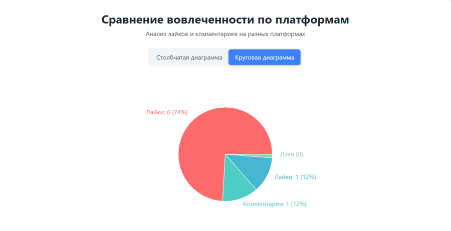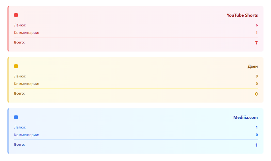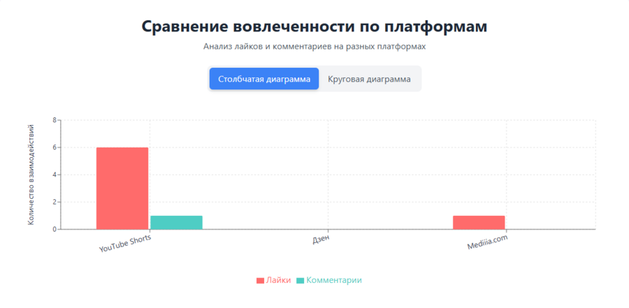 📊 Анализ вовлеченности: Ключевые показатели: • YouTube Shorts: 87,5% всех взаимодействий (7 из 8) • Mediiia.com: 12,5% взаимодействий (1 из 8) • Дзен: отсутствие активности