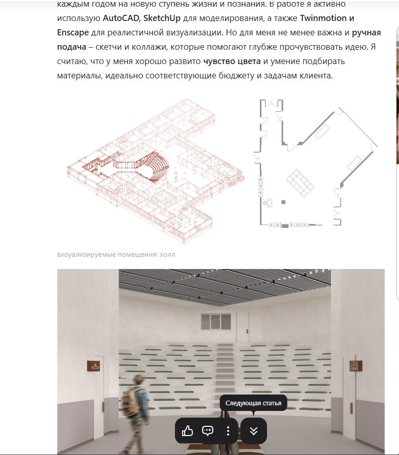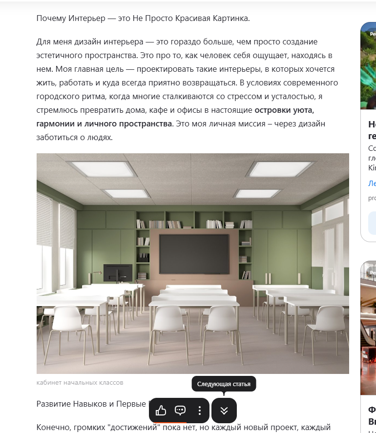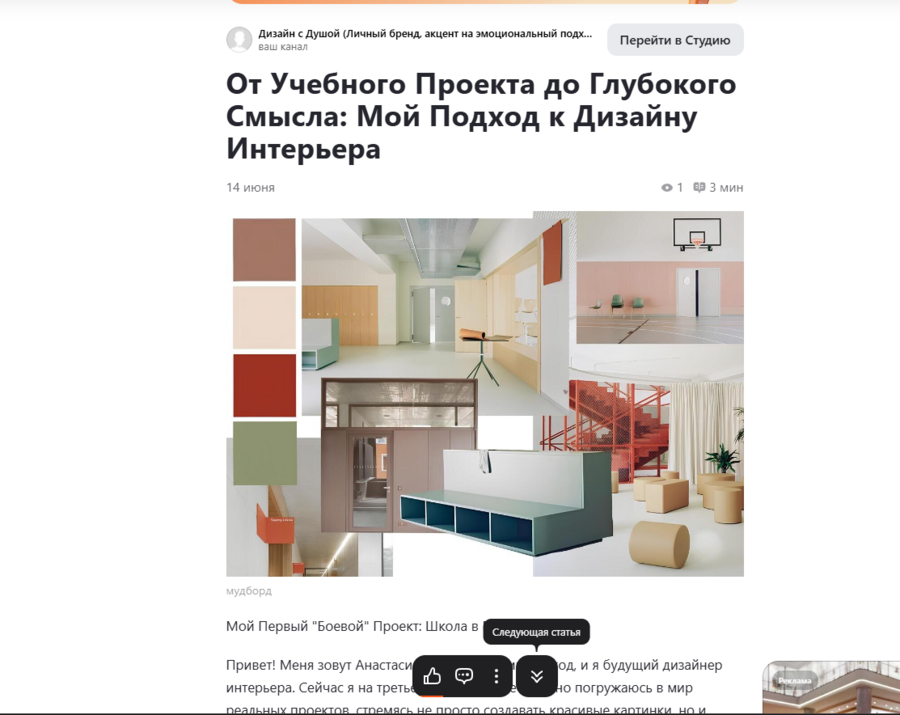 Тема и «крючок»: Возможно, тема «Влияние цвета на детей в интерьере школы» в визуальном формате оказалась более «цепляющей» и понятной с первого взгляда, чем общий лонгрид о подходе к дизайну, требующий полного прочтения.