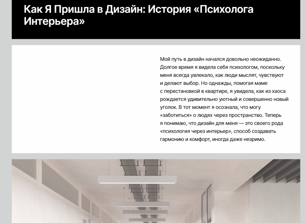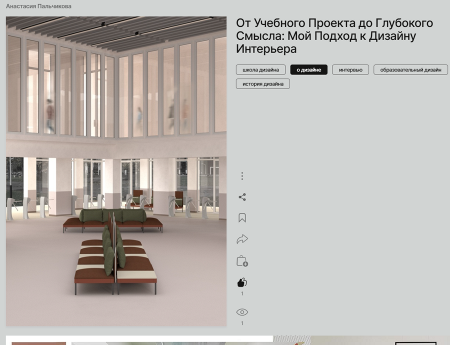Статья с SEO (из ДЗ 1): Название: «От Учебного Проекта до Глубокого Смысла: Мой Подход к Дизайну Интерьера» Ссылка на Дзен: https://dzen.ru/a/aE1HNzNWKktBkVYn Ссылка на Mediiia.com: https://mediiia.com/project/1e37a33c068a44129199f82fcd7f35d3