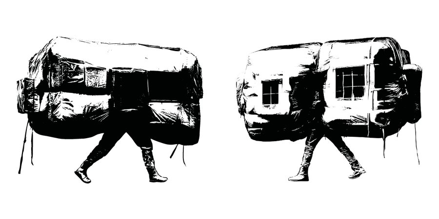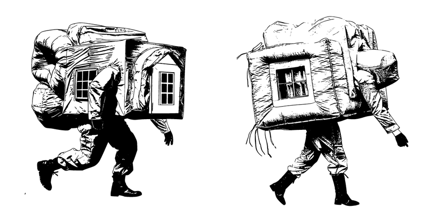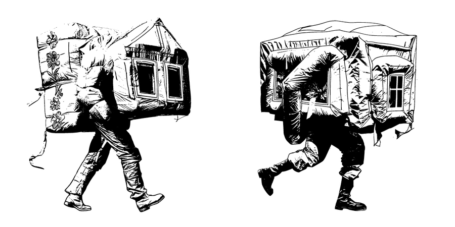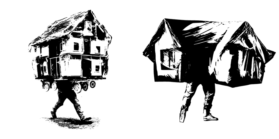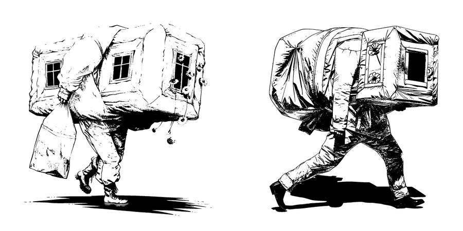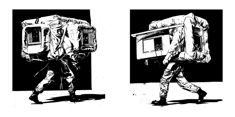 Создания образа персонажа основан на контрасте: он одновременно свободен и обречен, мобилен и скован, защищен и уязвим. Дом — это не только убежище, но и груз, который приходится нести. Дом в его понимании не привязан к месту, он временный и легко собирается заново. Минимализм и адаптивность — это не роскошное жилище, а строго необходимый минимум, который человек может унести с собой.