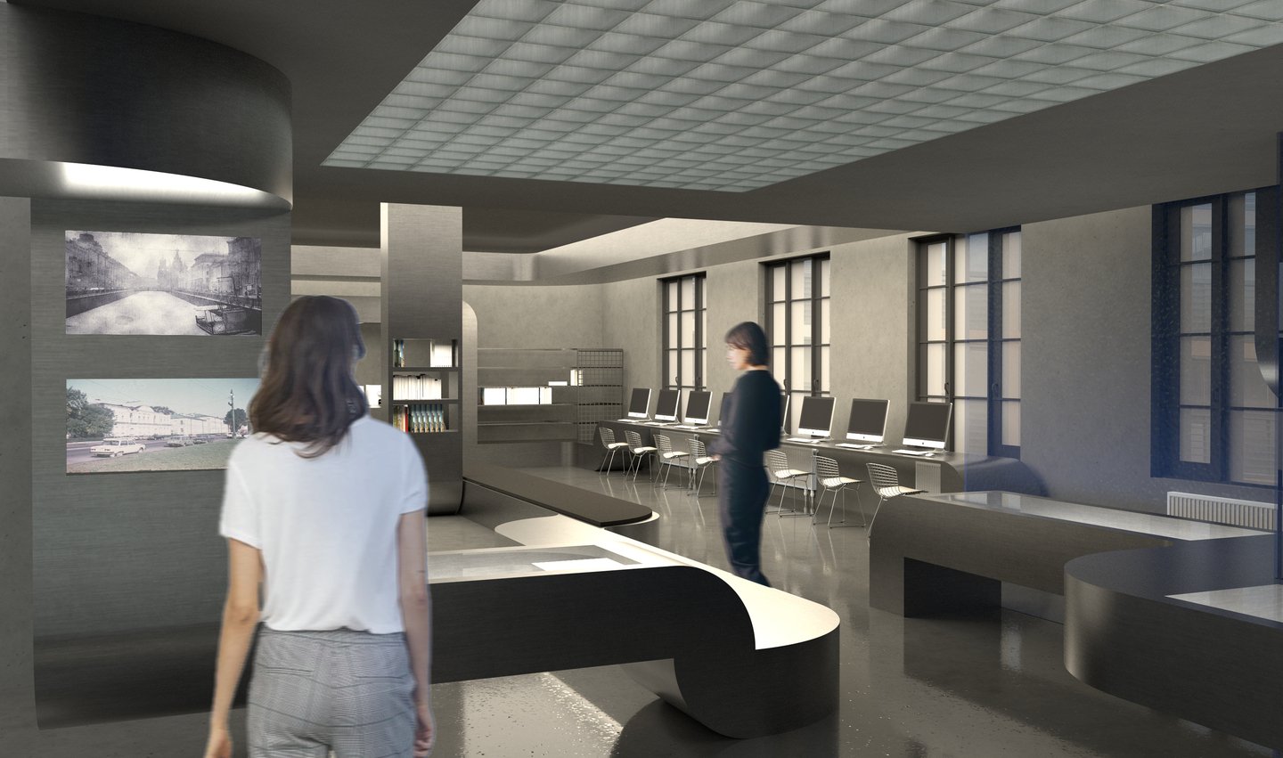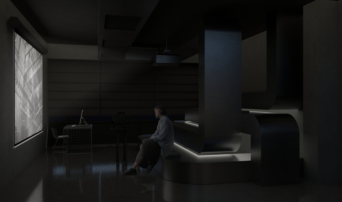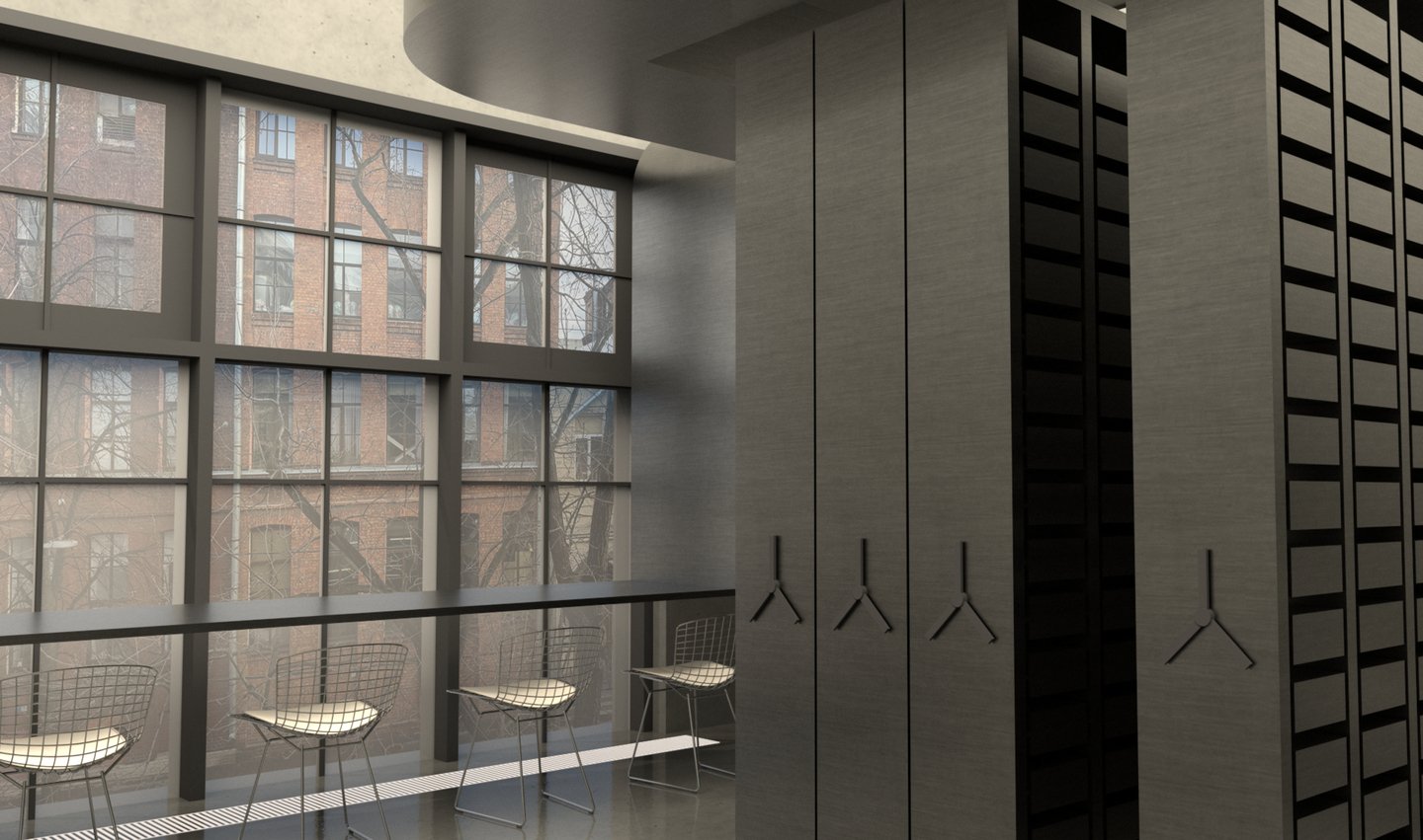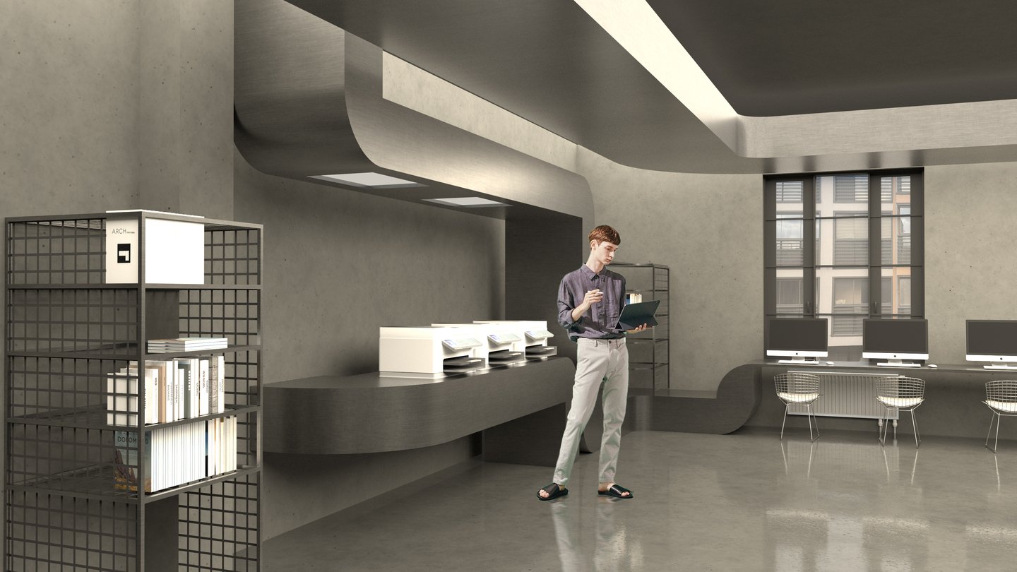 Ключевой образ — системы вентиляции, которыми наполнено пространство. Было принято решение «не бороться с ними, а развить их тему в интерьере». Стилистическим решением служат отсылки к диапозитивам, тем более, что в них и металлических конструкциях более сходств, чем кажется на первый взгляд…