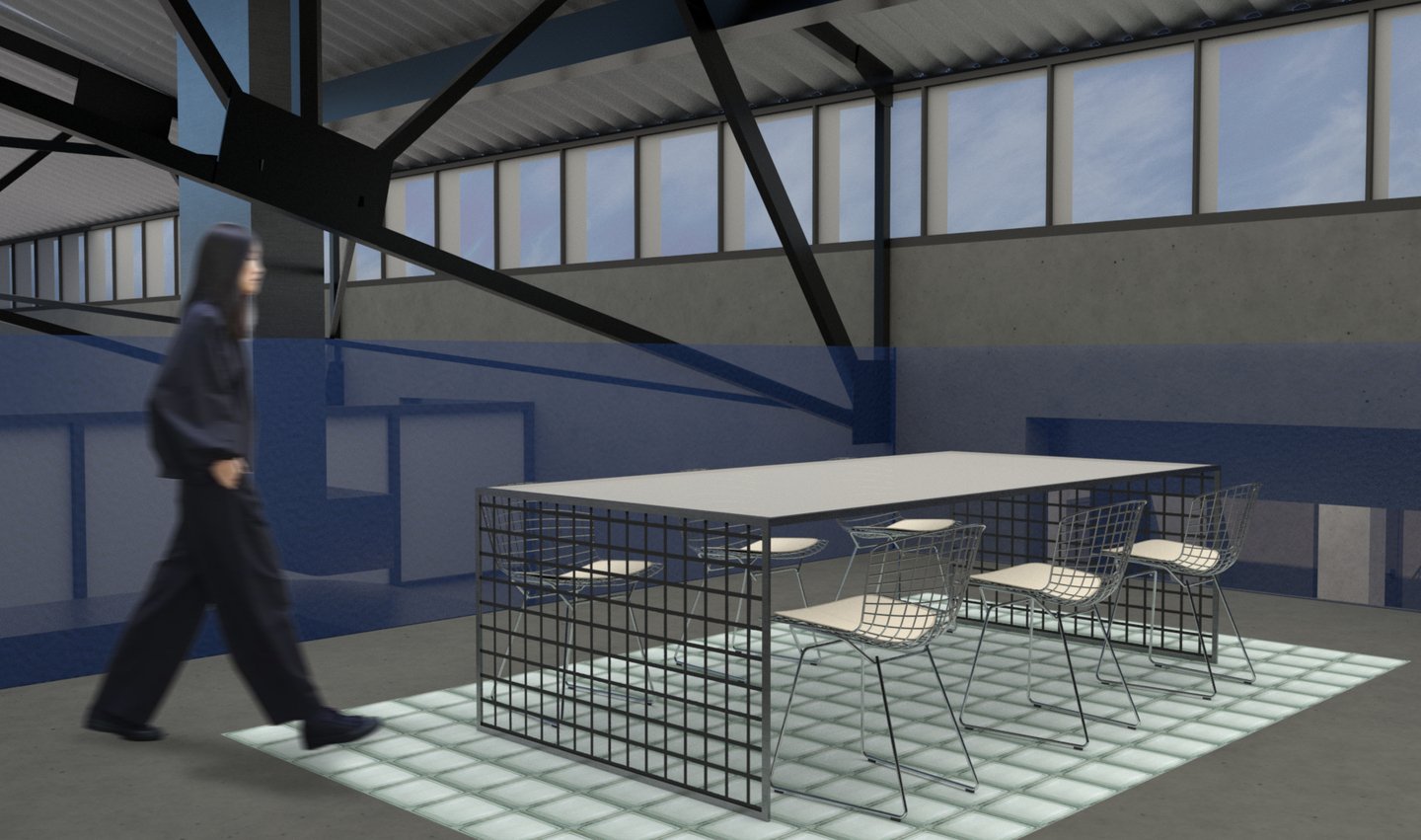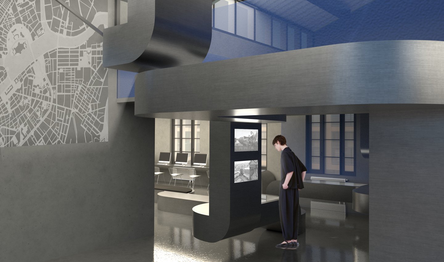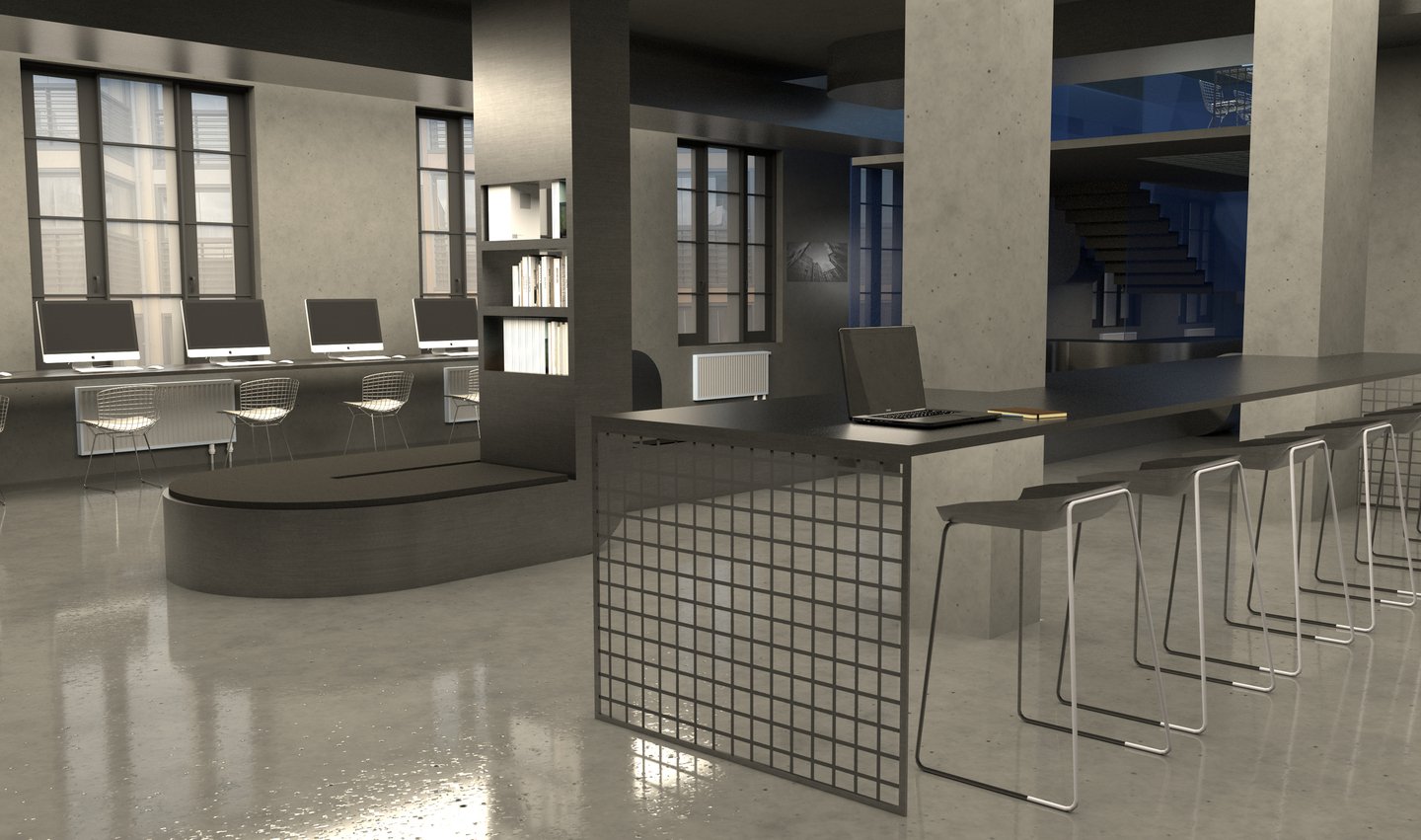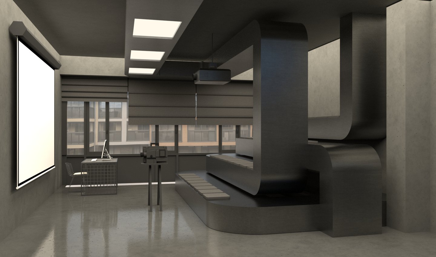 Ключевой образ — системы вентиляции, которыми наполнено пространство. Было принято решение «не бороться с ними, а развить их тему в интерьере». Стилистическим решением служат отсылки к диапозитивам, тем более, что в них и металлических конструкциях более сходств, чем кажется на первый взгляд…