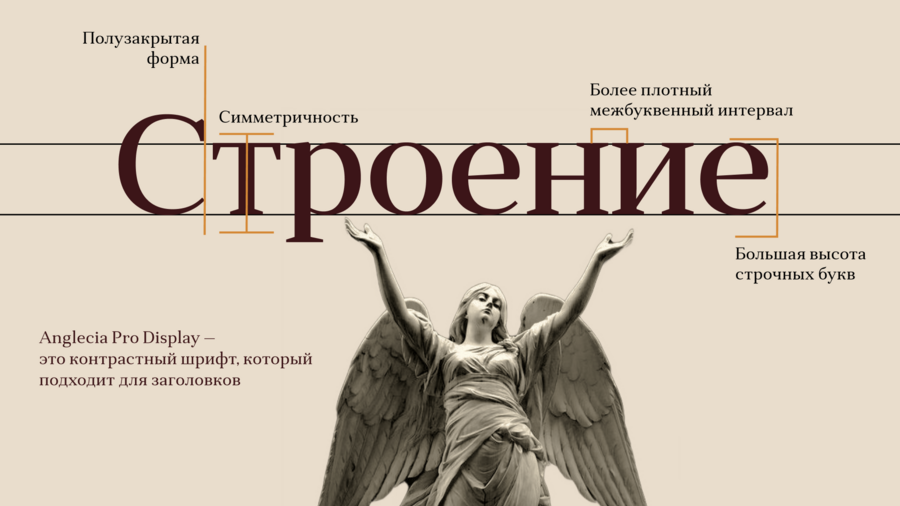 Лонгрид рассказывает об истории современной антиквы, дает детальное описание архитектуры шрифта. Он создан для передачи атмосферы Anglecia Pro Display, который ассоциируется с искусством и элегантностью.