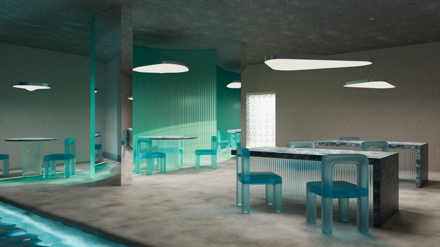 Голубые, зеленые и серые оттенки в интерьере отражают природность города, а материалы, такие как стекло, добавляют текстуры и отражения, создавая гармонию водной среды.
