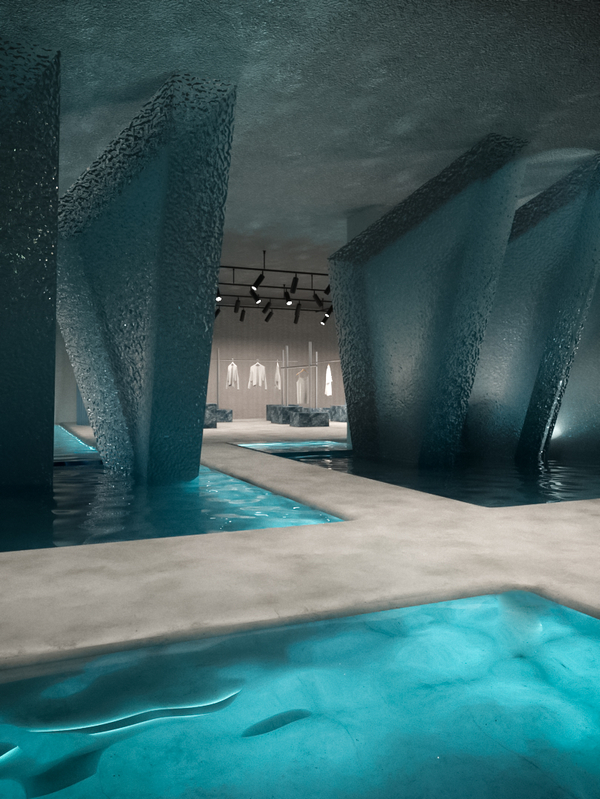 Чтобы передать ощущение полного окружения водой, почти весь первый этаж затоплен ею, предоставляя посетителям лишь узкие тропы для передвижения.