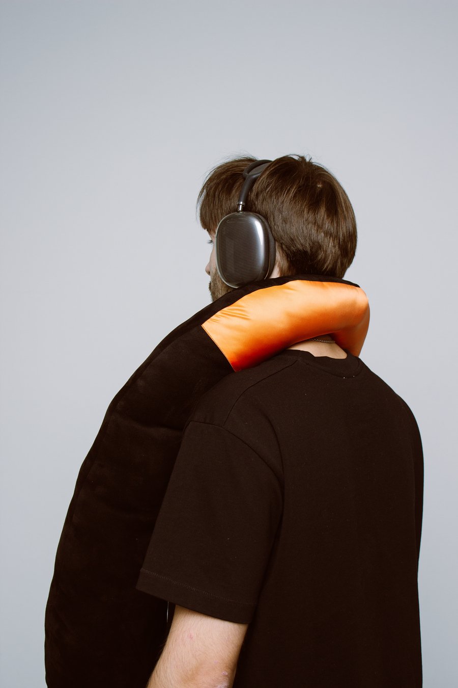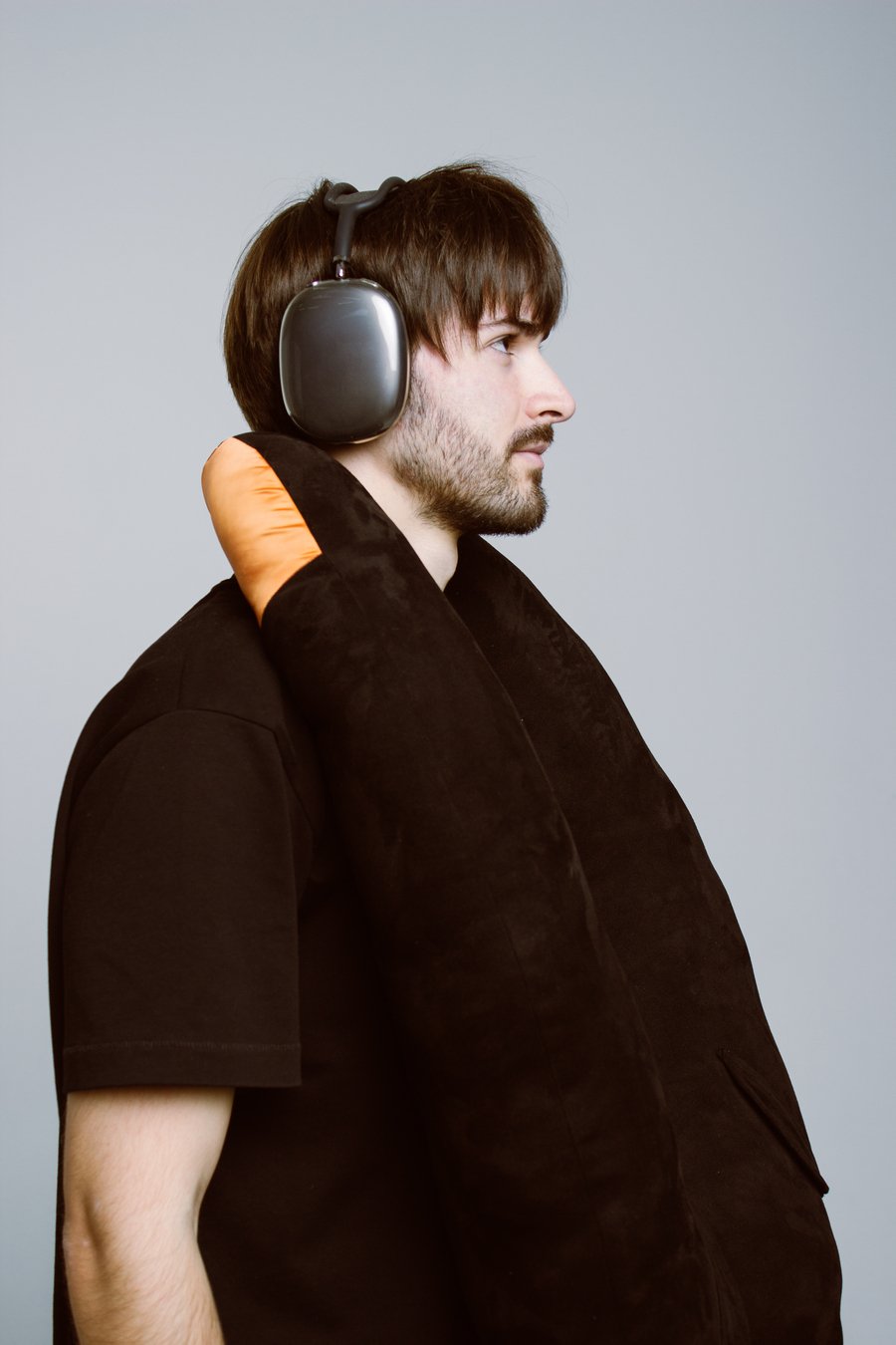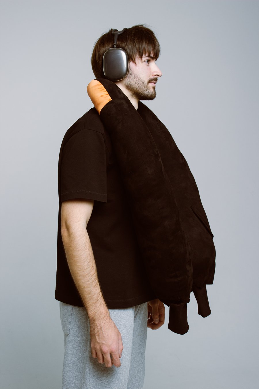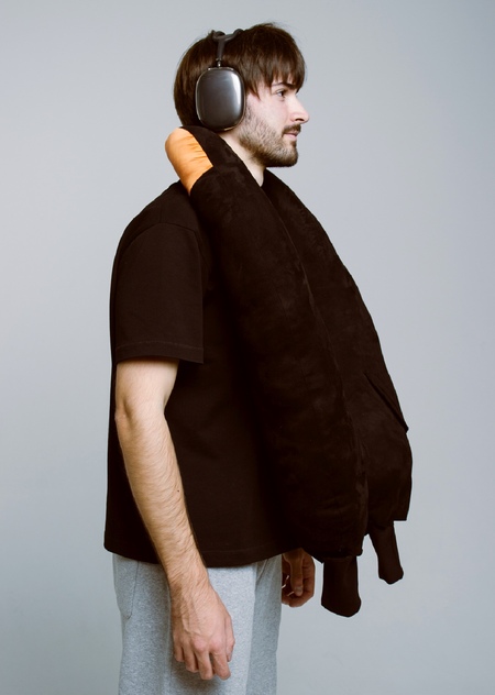 Вдохновением послужил типичный образ авиапассажира — человек в серых спортивных штанах, наушниках, в удобной верхней одежде и с подушкой для шеи. Объединив все эти элементы комфорта и практичности в одном предмете: получился «бомбер-подушка». Это гибрид верхней одежды и дорожной подушки — по форме и размерам как бомбер, но с мягкой структурой, манжетами, оранжевой подкладкой и брелком на рукаве.
