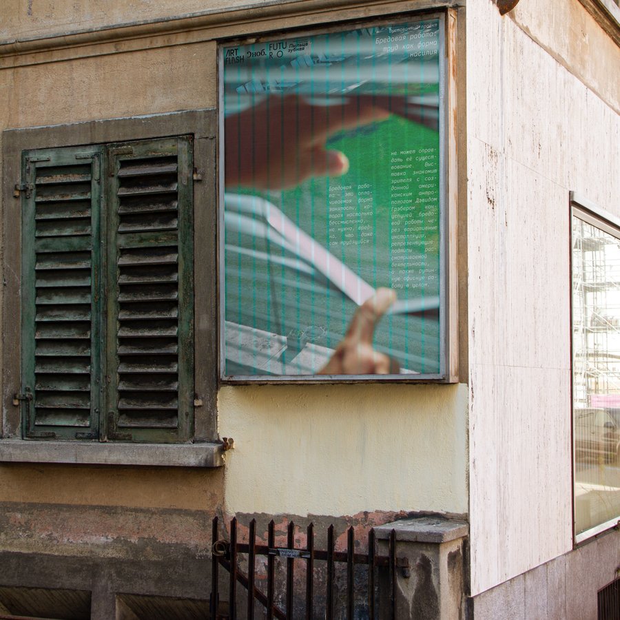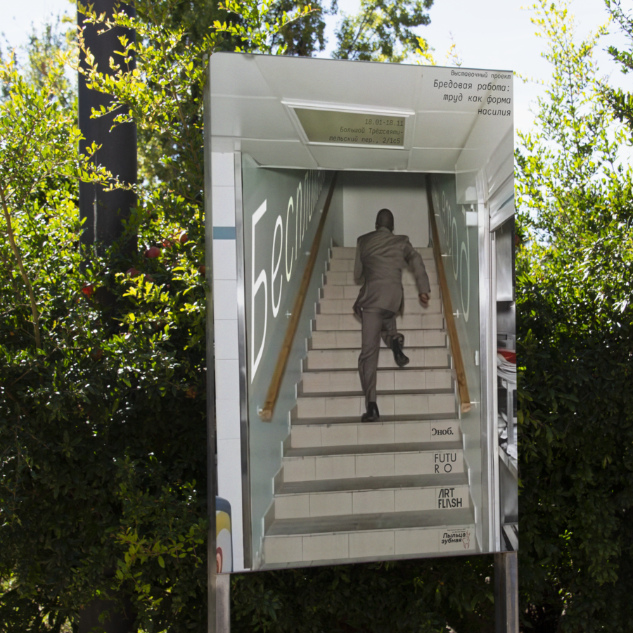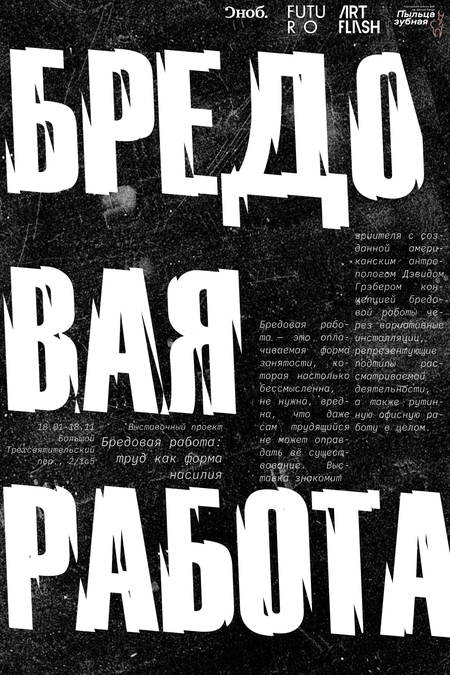 Выставка даёт зрителю возможность отрефлексировать эту проблему, или, как минимум, задуматься, касается ли она его самого. Экспозиция размещается в офисе. Она представляет из себя 3 этажа, каждый из которых обладает своей уникальной тематикой. Деление на залы отсутствует, что обеспечивает у зрителя нехватку чувства приватности: он становится проекцией тех, кто работает на бредовой работе в офисе. Начало осмотра экспозиции предполагается на последнем этаже: постепенно посетитель спускается вниз, стремится к выходу из офиса, что выступает метафорой желания прекратить заниматься бредовой работой.