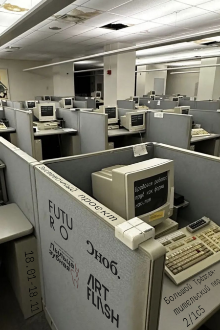 Выбор пространства для экспонирования не случаен: заброшенный офис значится метафорой отказа от бредовой работы.