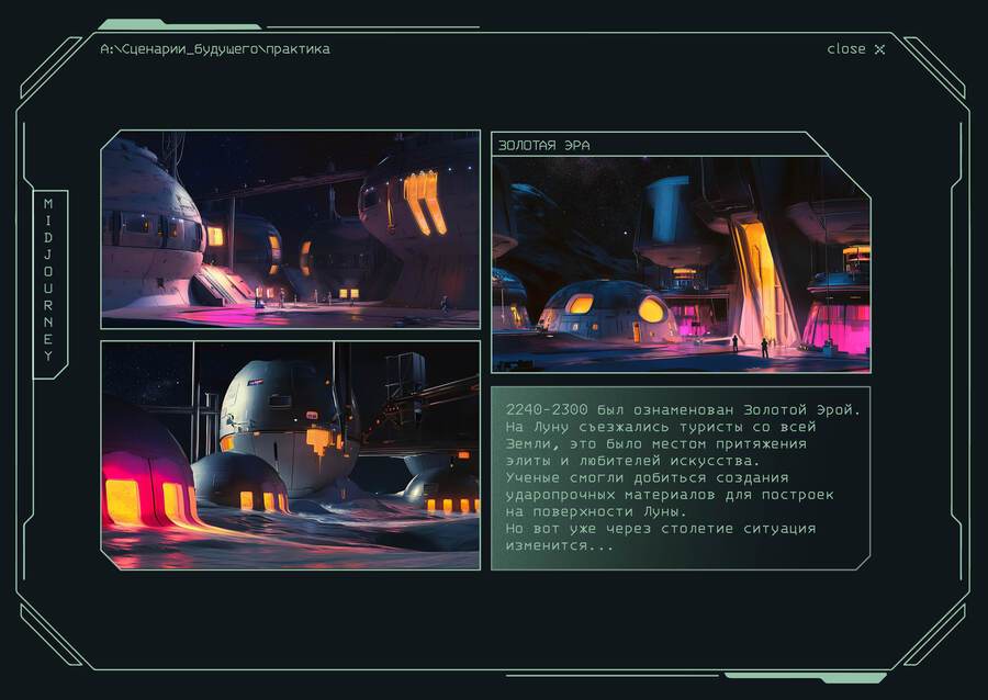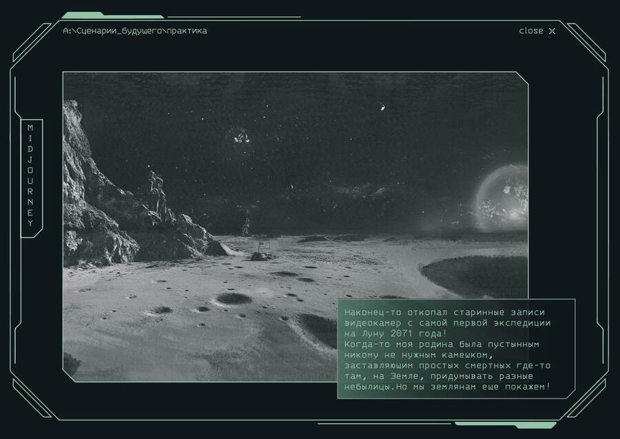 Мой проект — это рассказ о масштабном сценарии будущего через точку зрения выдающегося инженера Юрия Спутник-1. Наступил 2071 год, и с того момента началась первая экспедиция по освоению Луны под руководством амбициозного миллиардера Оза.