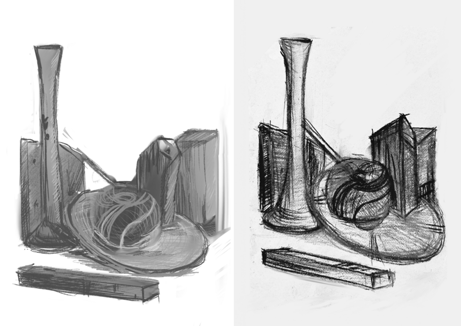 Быстрый эскиз. Задача передать минимальными средствами свойства предметов, форму, пропорции, материал, фактуру, тон.