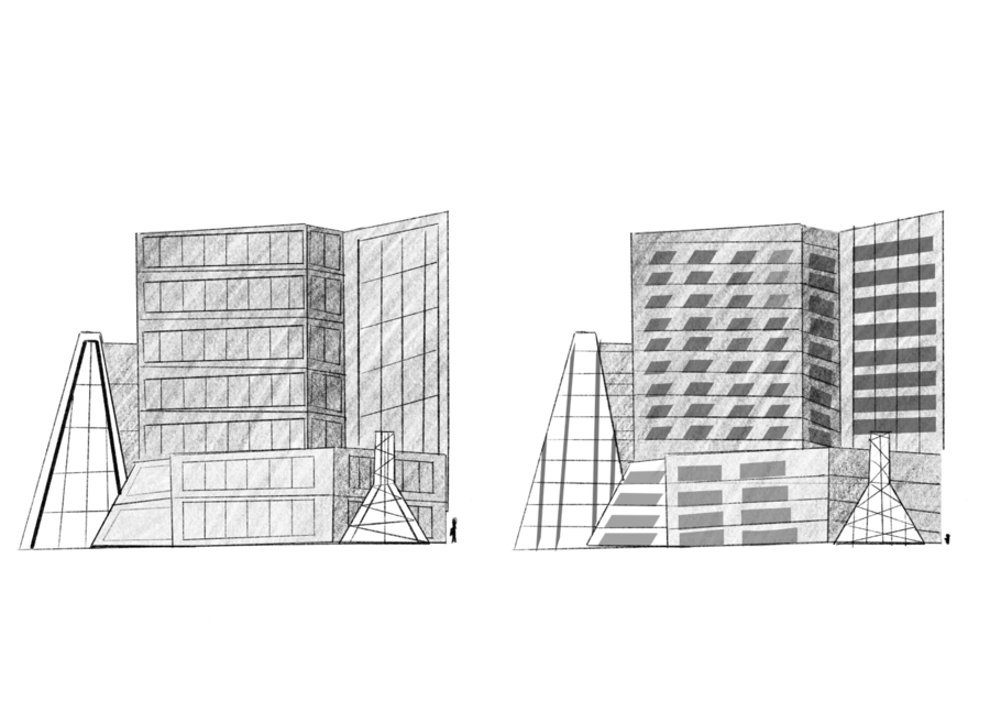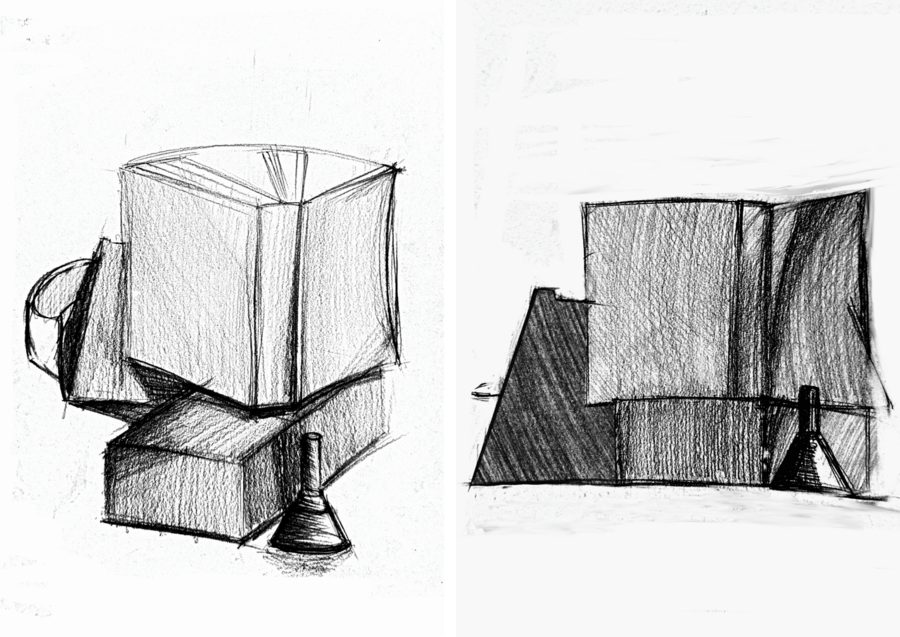 Послойный рисунок: контур, силуэт, светотень, структура. Линия горизонт. Изменение масштаба. Натюрморт — городская среда. Членение объёма, масштаб.