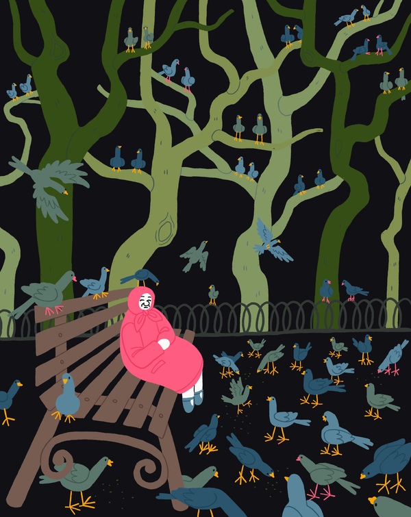 Эта серия многофигурных иллюстраций показывает жизнь немного глуповатых голубей под разными ракурсами.