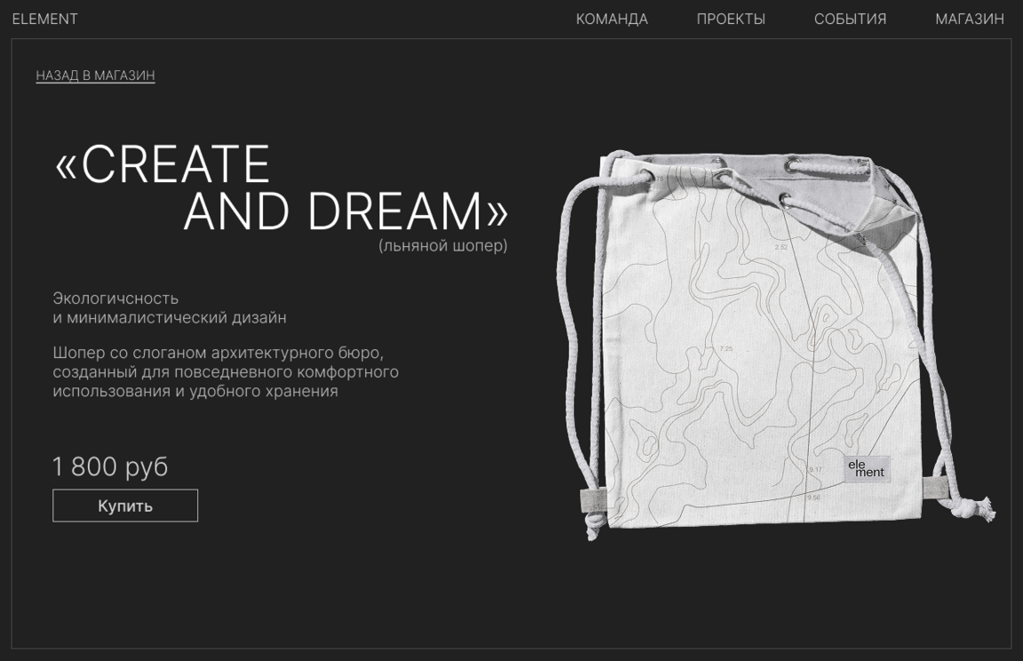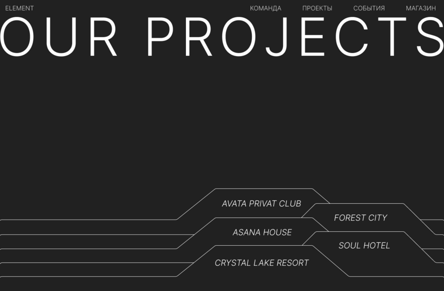 Дизайн сайта архитектурного бюро Element построен на стилистической концепции минимализма, где строгость и простота форм отсылают к суровой красоте горных ландшафтов.
